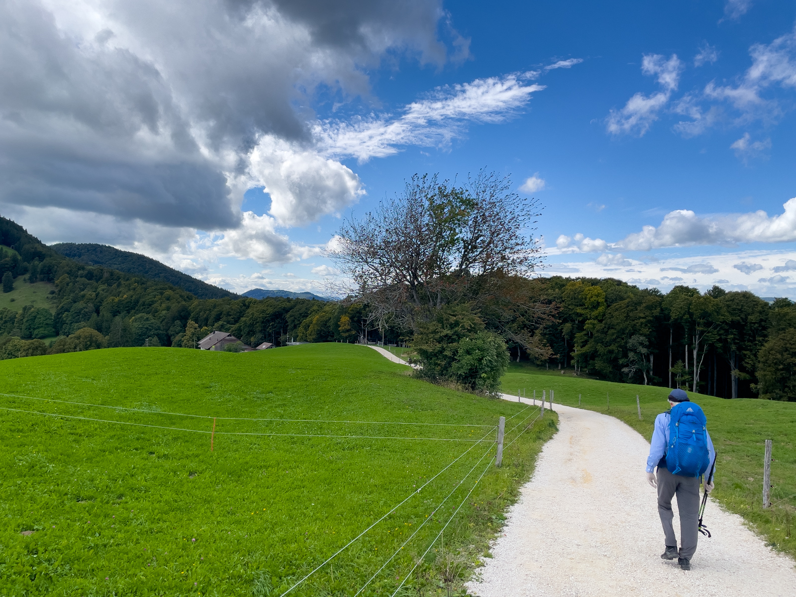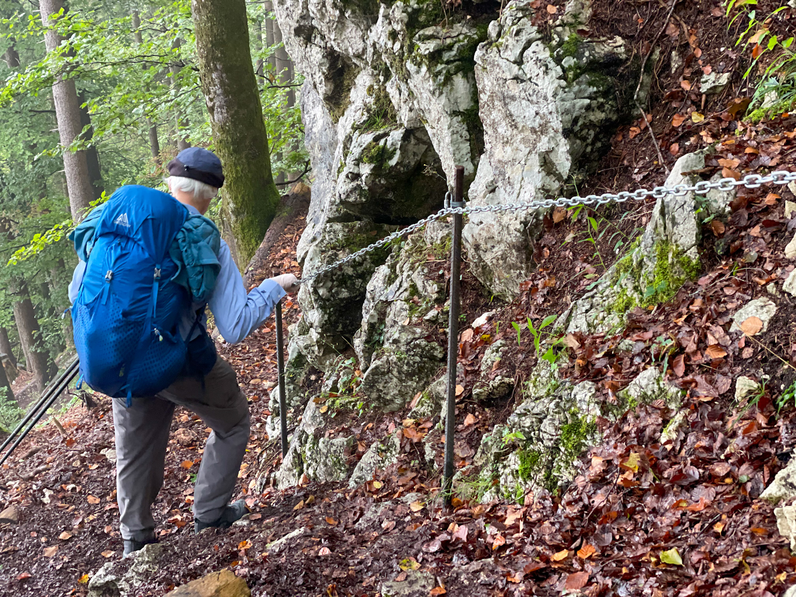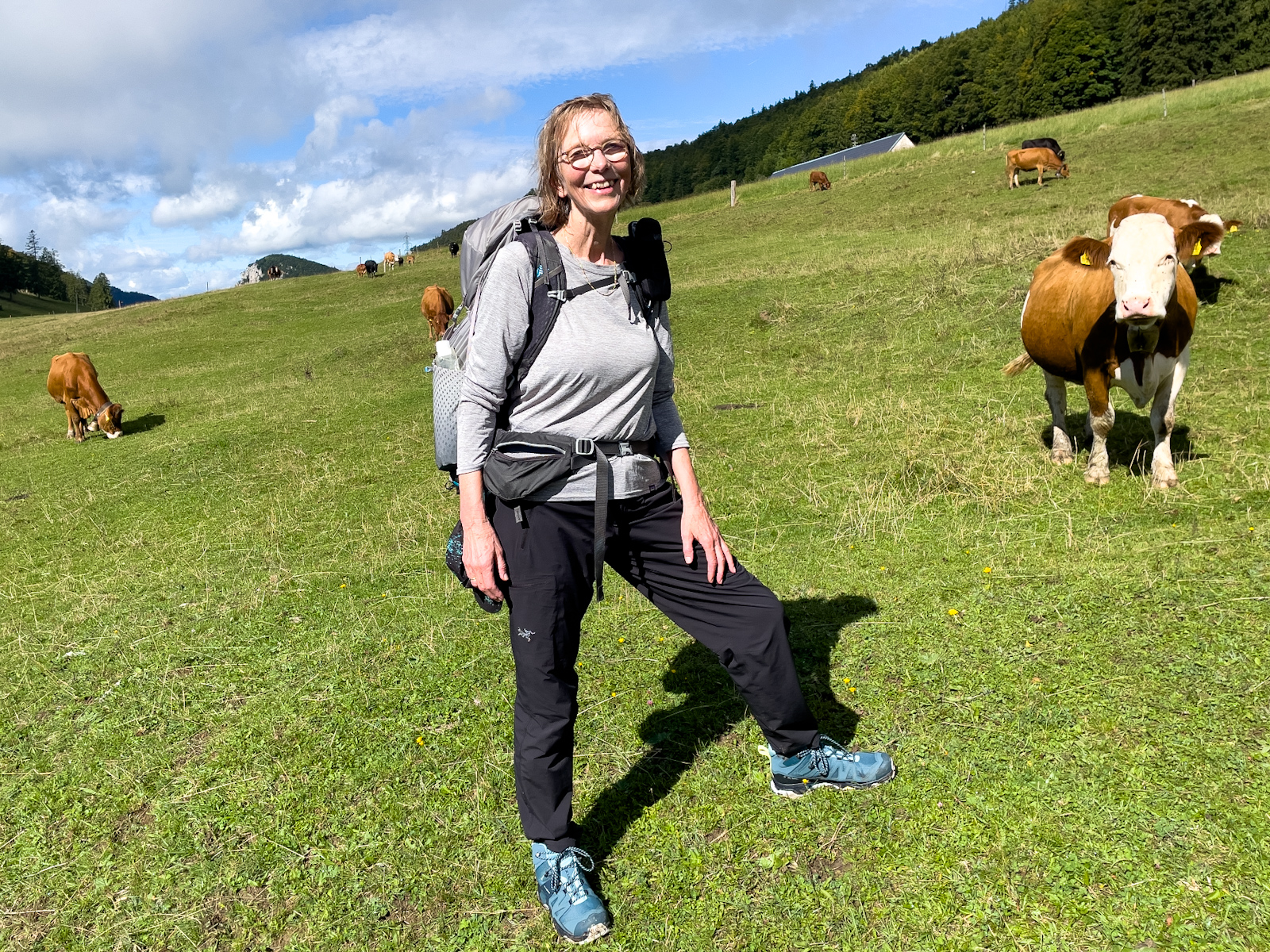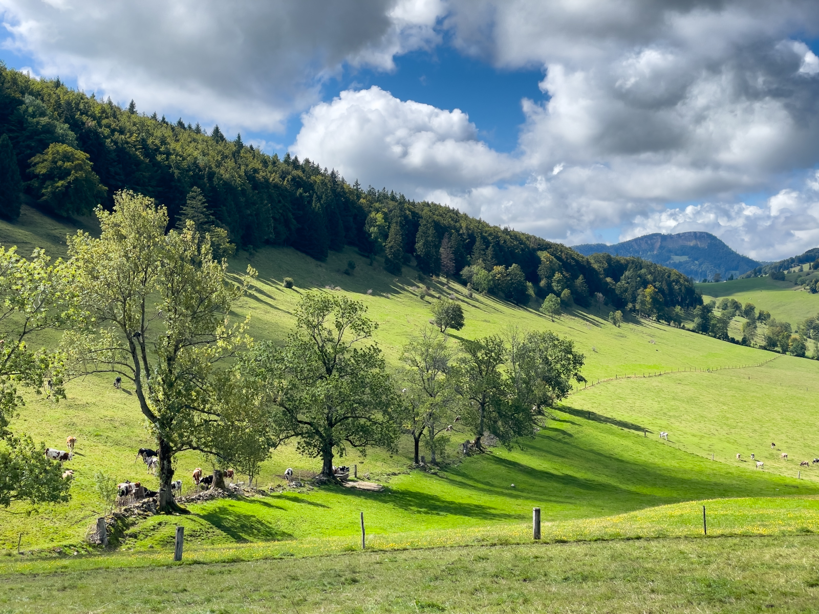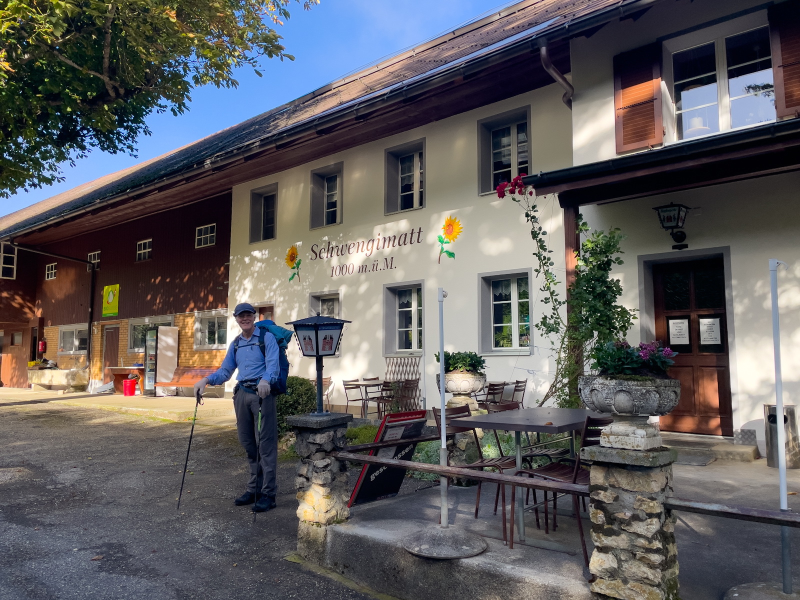 Om kwart voor tien komen we uit het bos en kijken we uit op brede weiden. We passeren Berggasthof Schwengimatt (gesloten). Het is kwart voor tien en we hebben al bijna 600 meter geklommen. De omgeving is hier prachtig. Glooiend, groen, bloemetjes, koeien, bomen en af en toe een boerderij. We duiken opnieuw het bos in. Omhoog en omlaag. Rotsige paadjes. Soms zo steil dat er kettingen zijn om aan vast te houden.