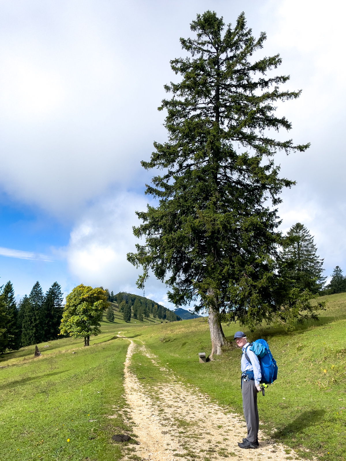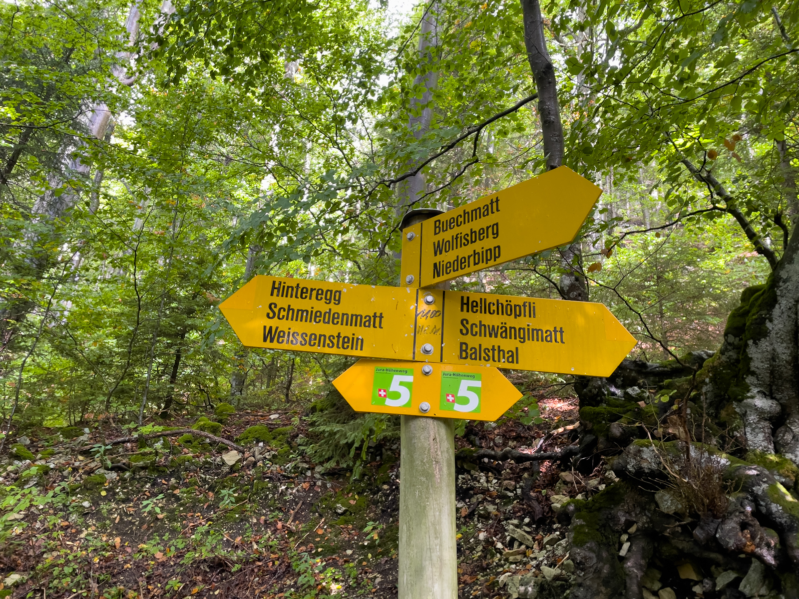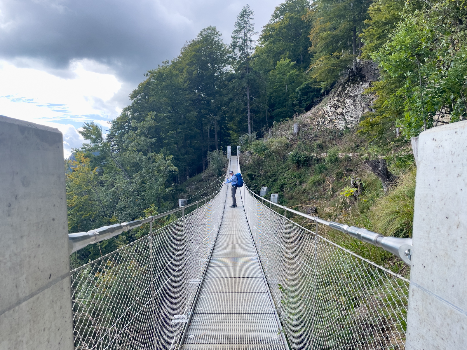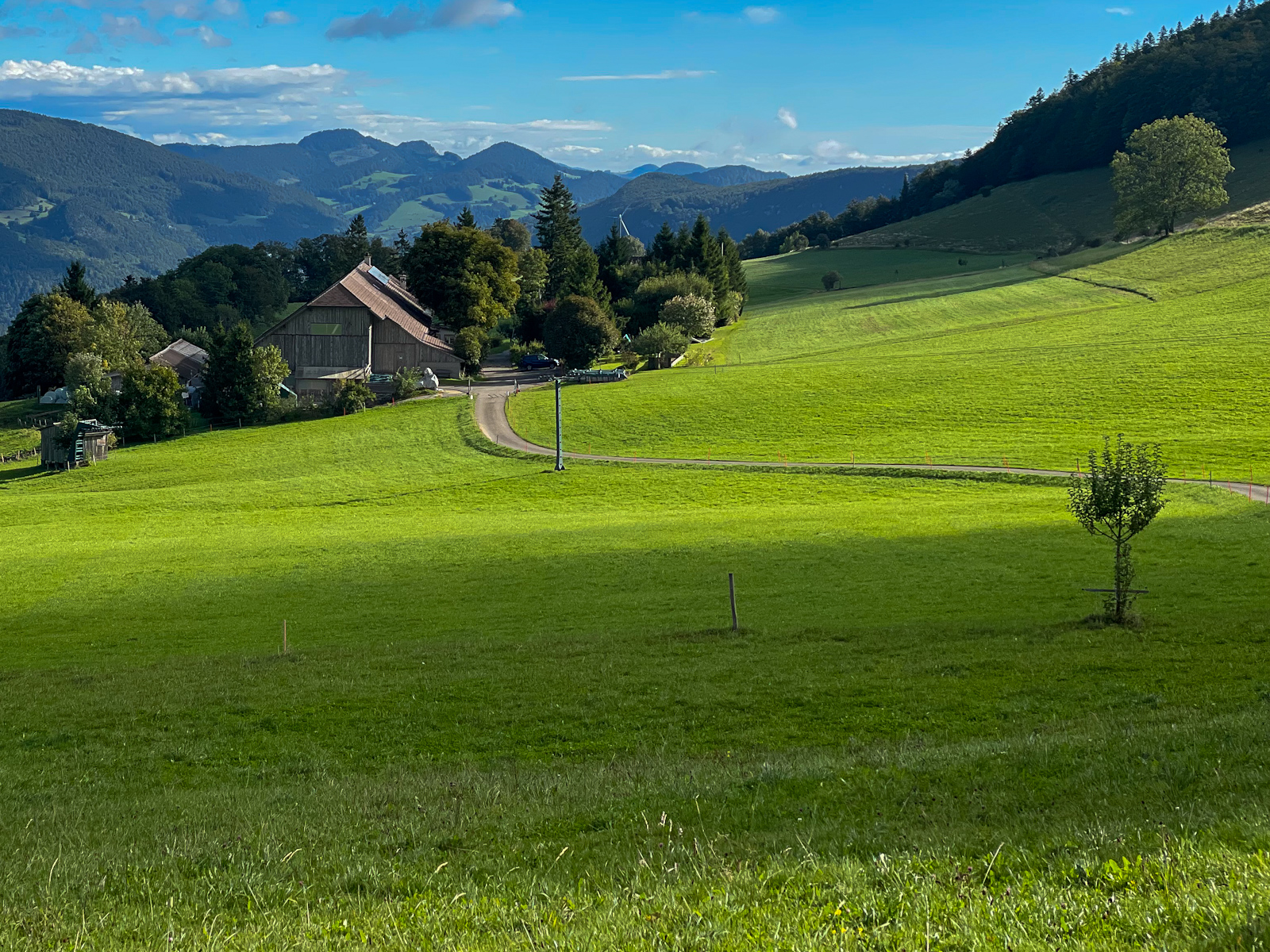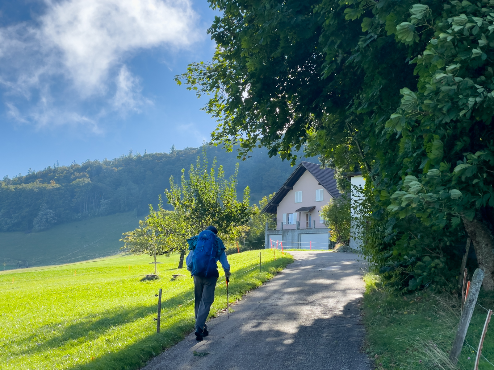 Om kwart voor tien komen we uit het bos en kijken we uit op brede weiden. We passeren Berggasthof Schwengimatt (gesloten). Het is kwart voor tien en we hebben al bijna 600 meter geklommen. De omgeving is hier prachtig. Glooiend, groen, bloemetjes, koeien, bomen en af en toe een boerderij. We duiken opnieuw het bos in. Omhoog en omlaag. Rotsige paadjes. Soms zo steil dat er kettingen zijn om aan vast te houden.