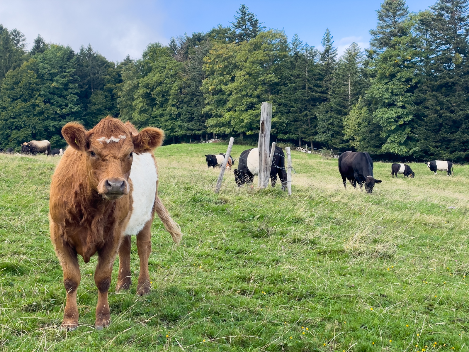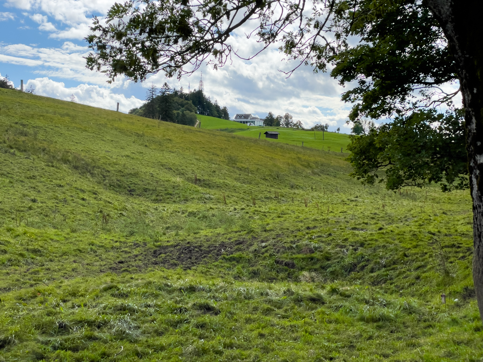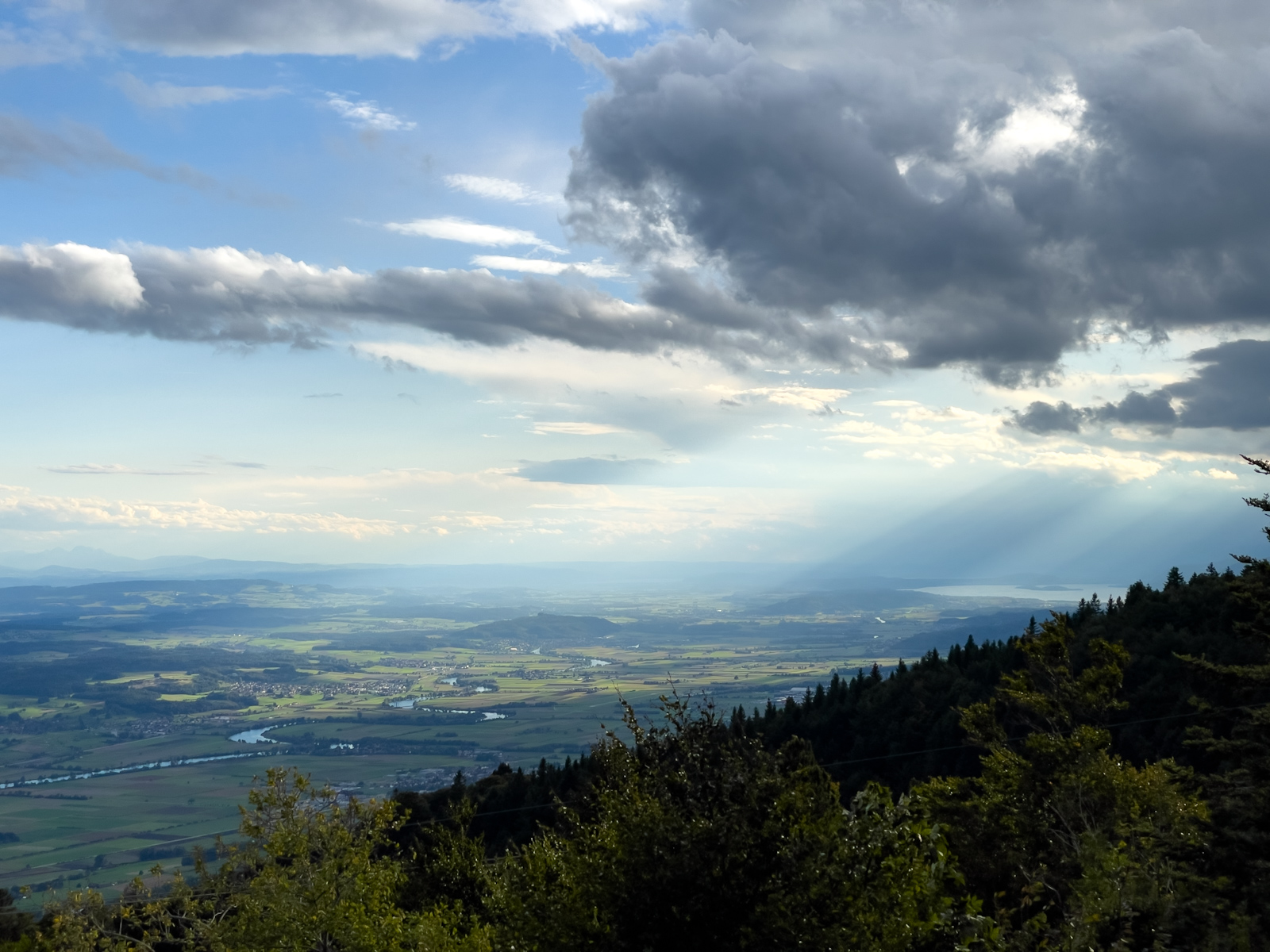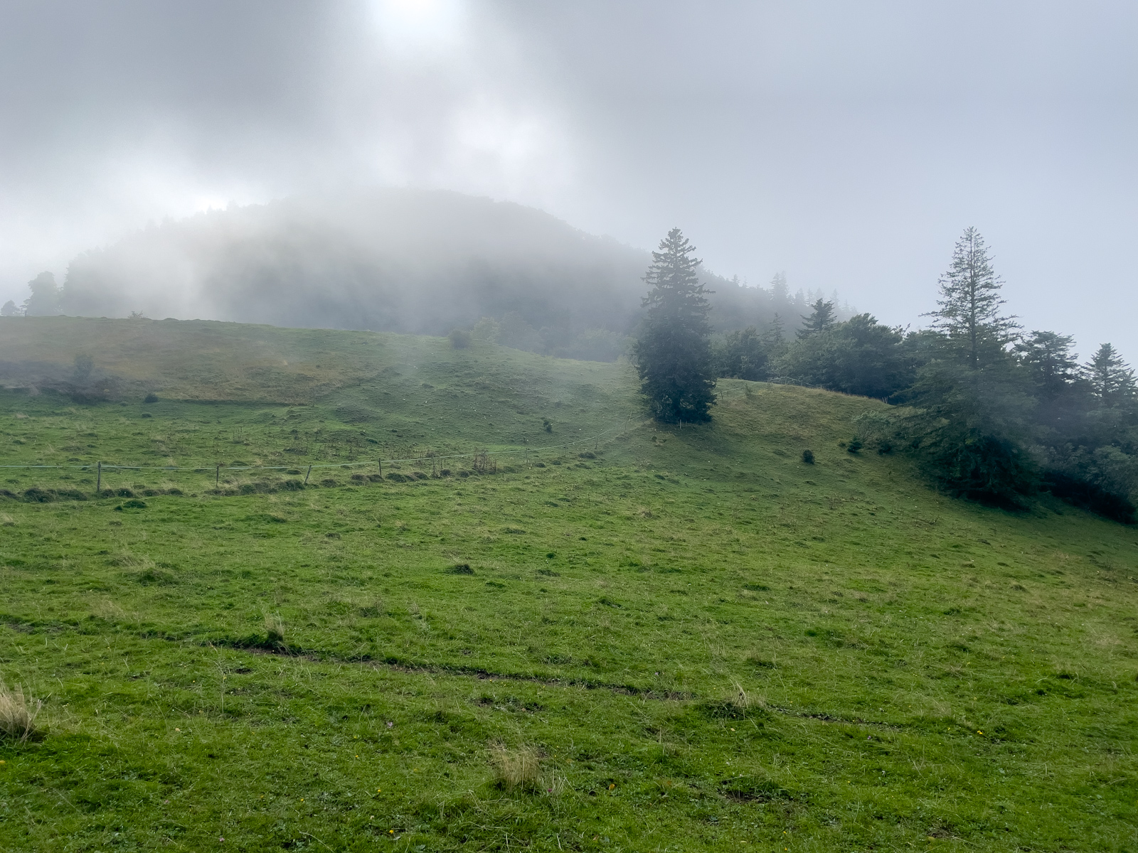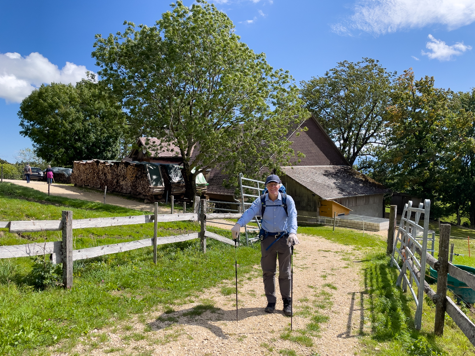 Om kwart voor tien komen we uit het bos en kijken we uit op brede weiden. We passeren Berggasthof Schwengimatt (gesloten). Het is kwart voor tien en we hebben al bijna 600 meter geklommen. De omgeving is hier prachtig. Glooiend, groen, bloemetjes, koeien, bomen en af en toe een boerderij. We duiken opnieuw het bos in. Omhoog en omlaag. Rotsige paadjes. Soms zo steil dat er kettingen zijn om aan vast te houden.