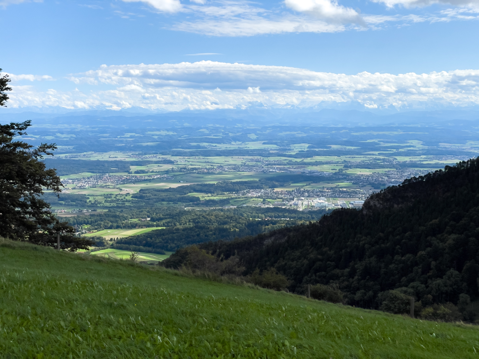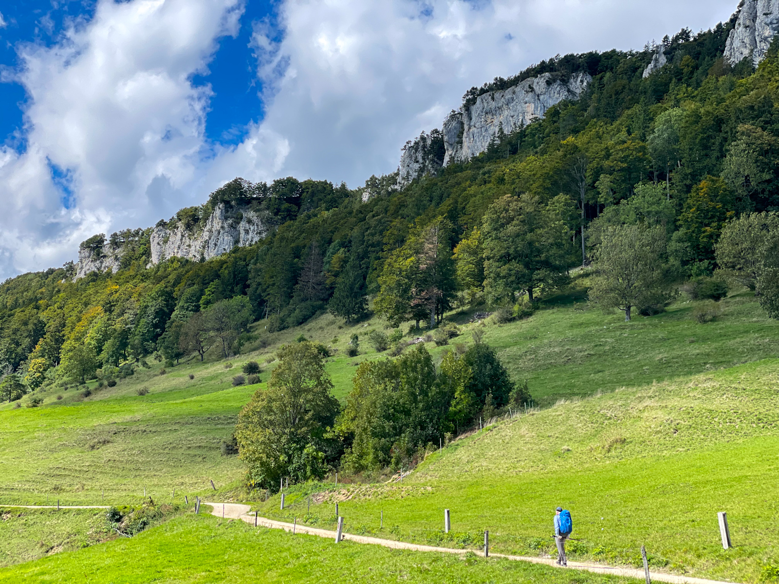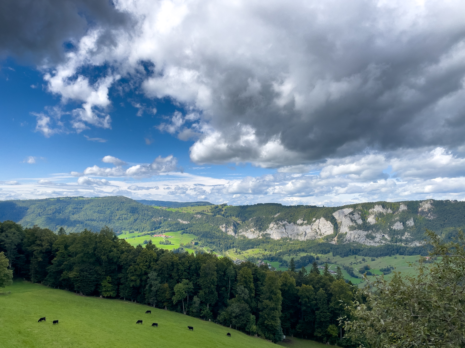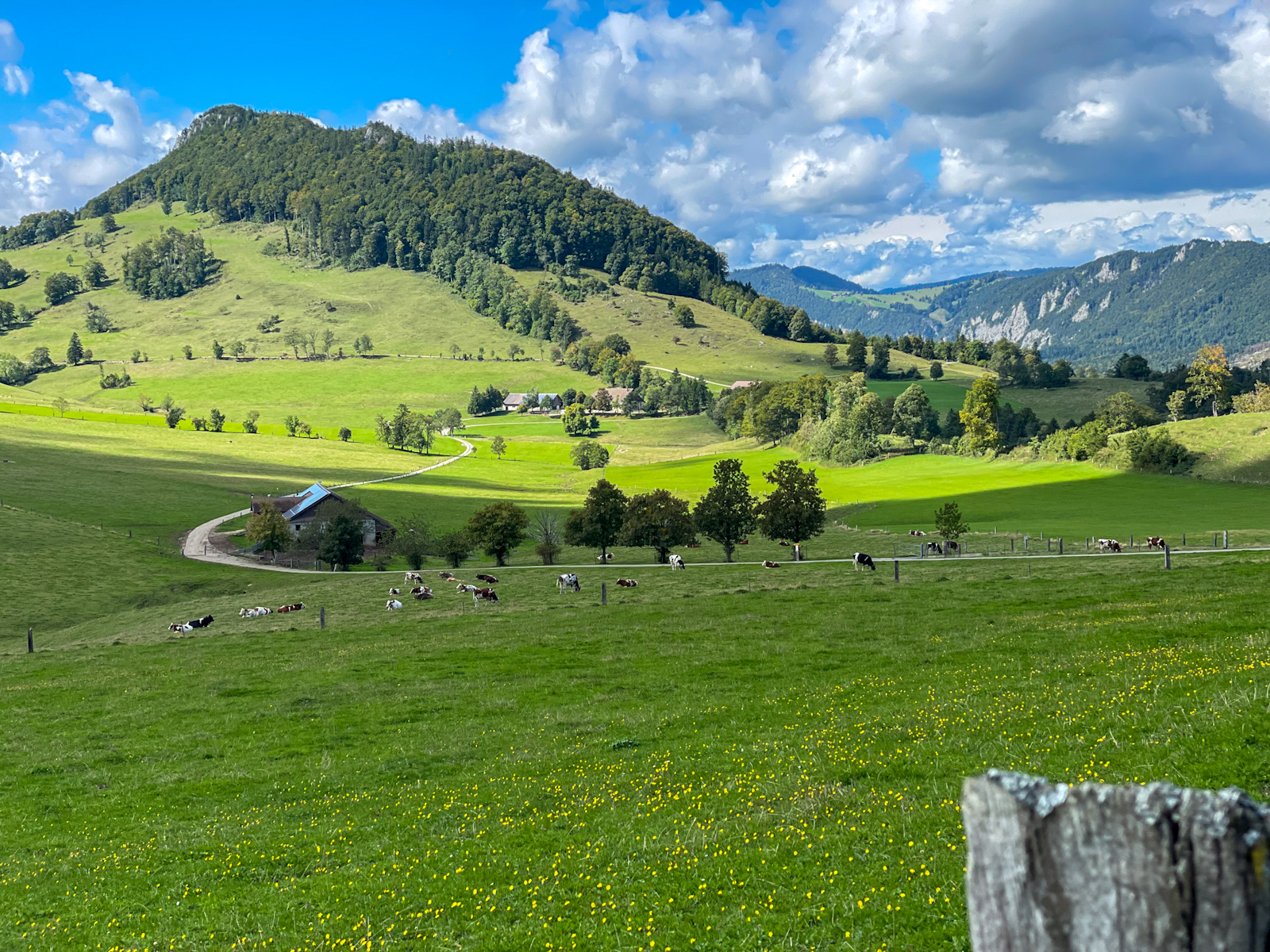 Na de lunch gaat de route verder over prachtige open hellingen en langs karakteristieke Jura-rotsen. We hebben steeds vaker uitzicht op het Mittelland en de Alpen. Het is hier verrassend mooi en zo fantastisch groen.