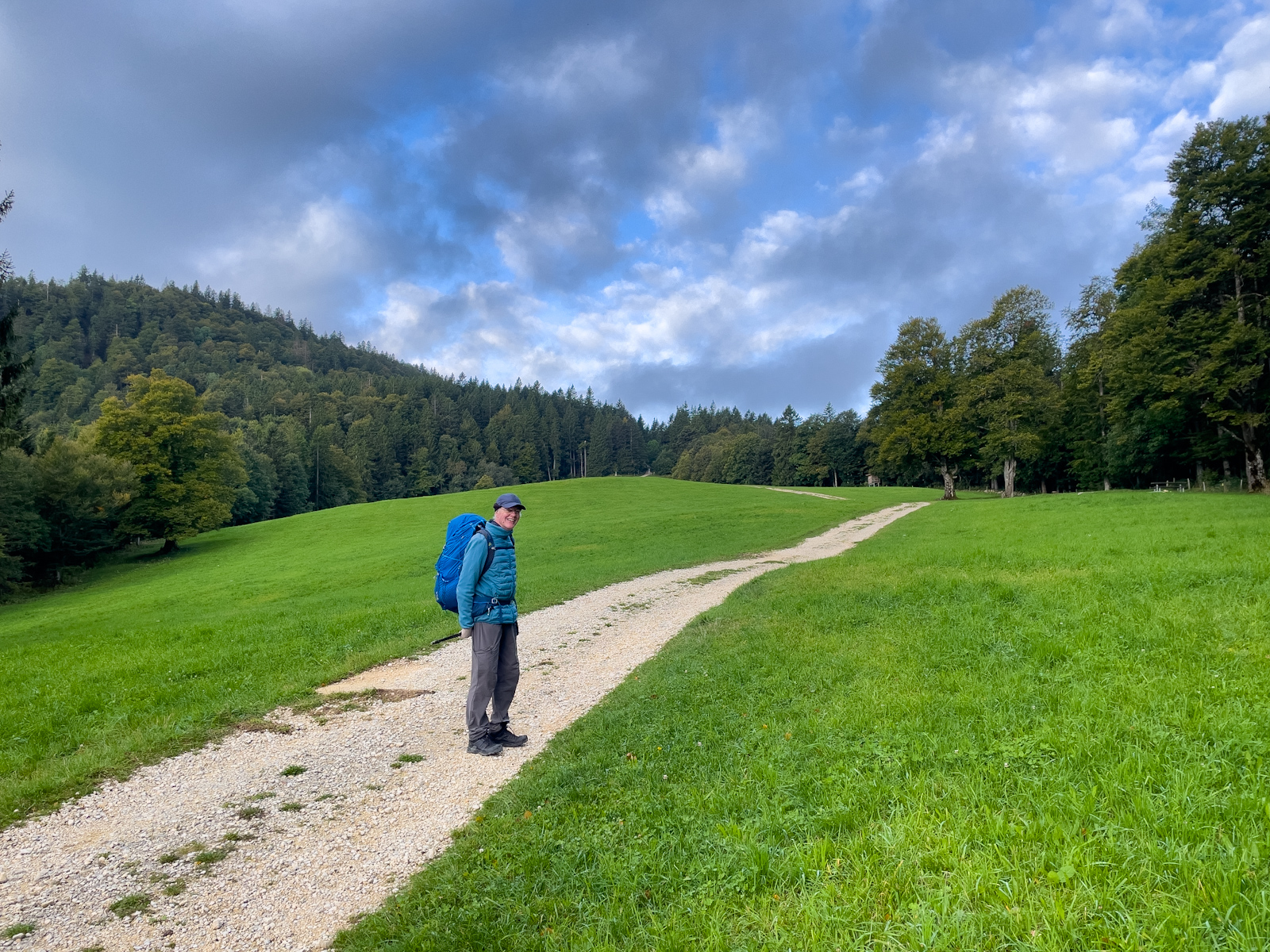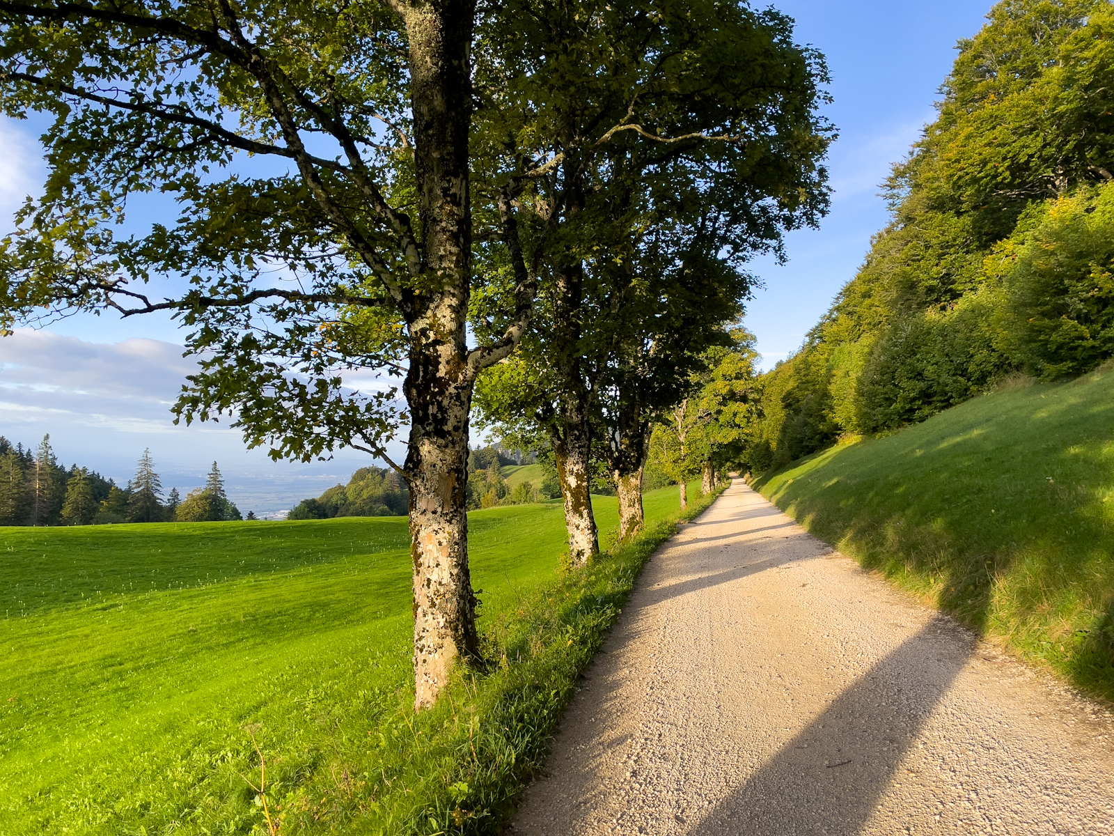 Na de lunch begint de lange afdaling naar Frinvillier. We smokkelen een stukje en lopen tot Wasmäli over een verhard weggetje in plaats van over het bospad. Het loopt wat sneller en zo winnen we wat tijd. Het is een lange etappe vandaag.