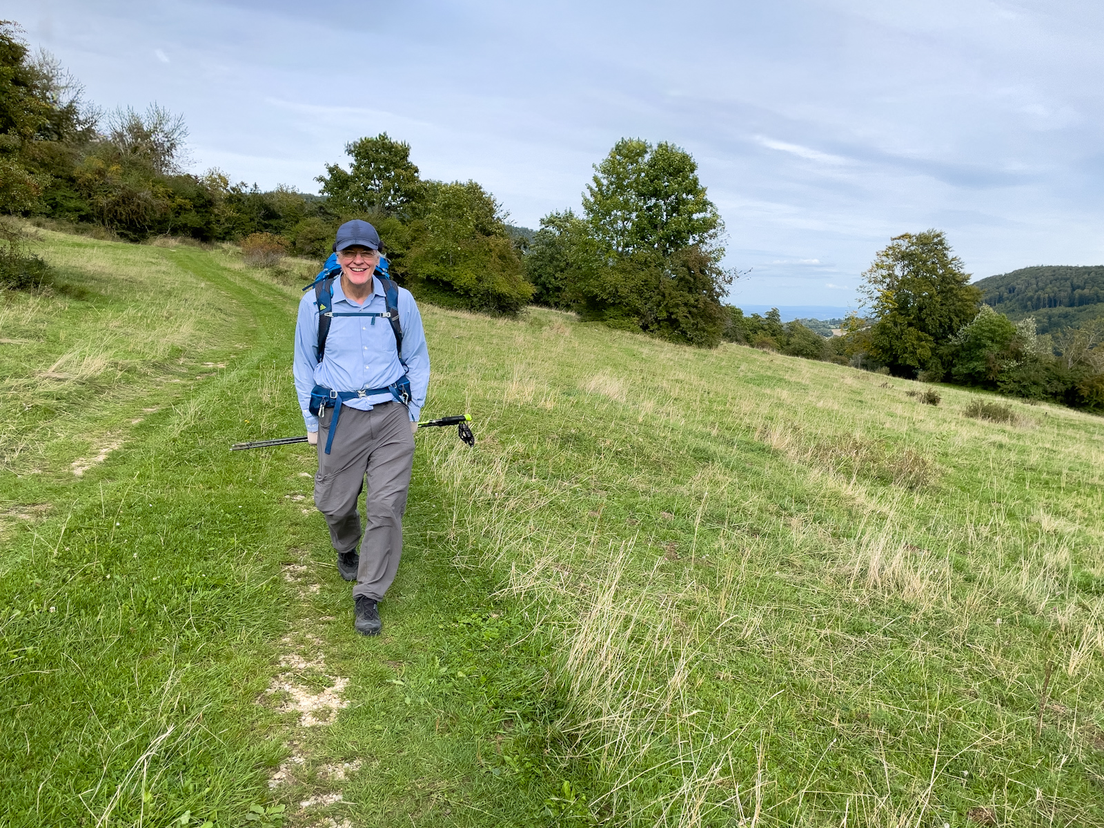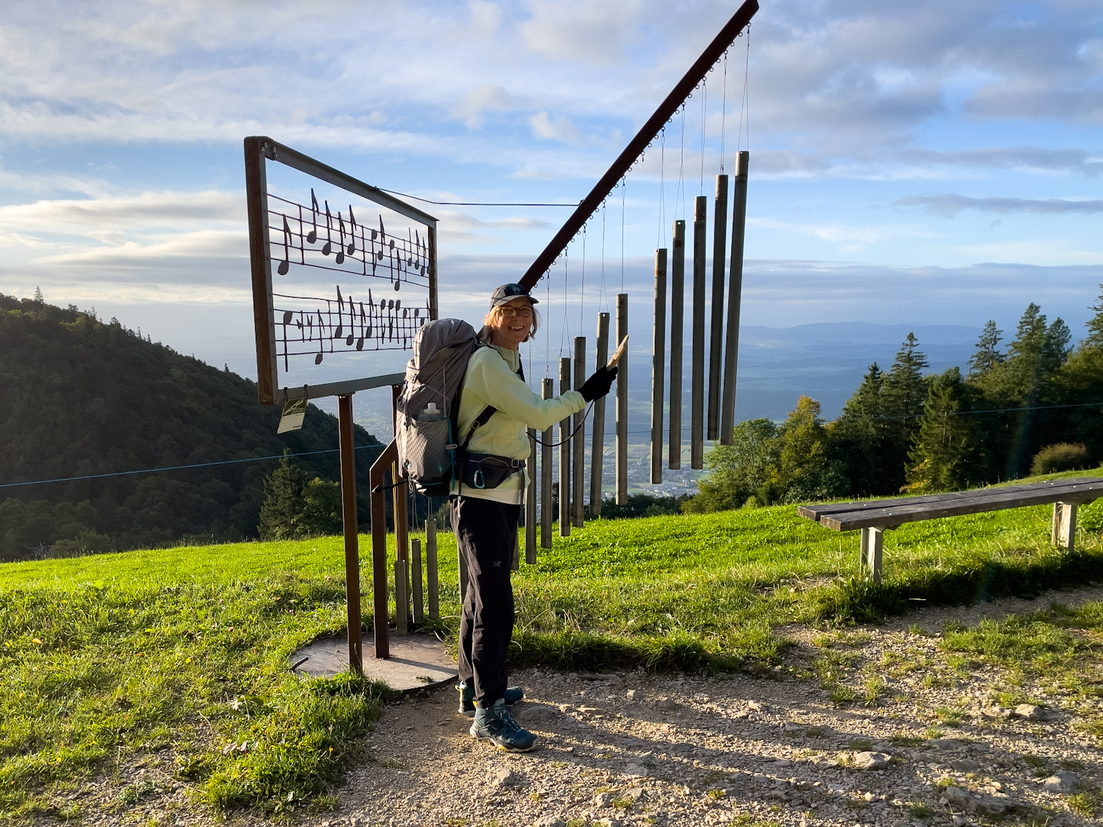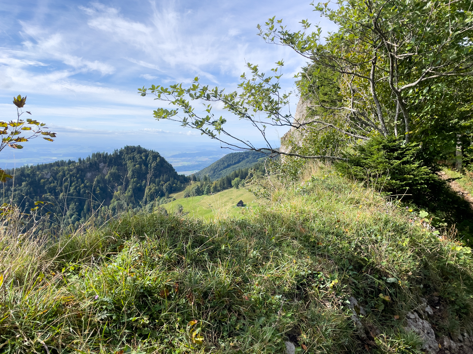 We klimmen door de bossen naar de Stallflue, een markante top op de Jura Crest Trail. Boven op de kam staat een groot kruis en hebben we prachtig uitzicht over het Mittelland en de golvende Juraheuvels. We dalen weer af om even later weer flink te klimmen naar de kam. We blijven nu wat langer hoog lopen. Mooi! Opnieuw passeren we een kruis.