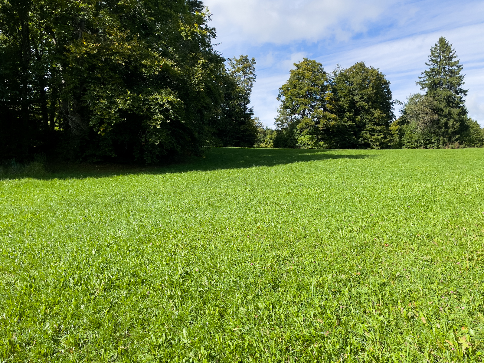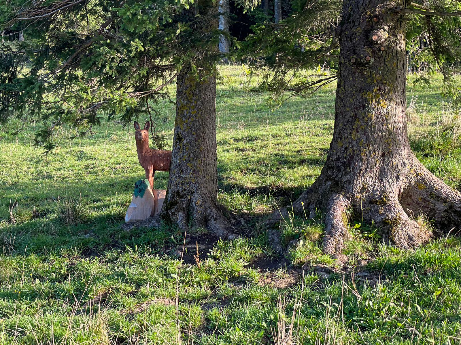 We dalen verder af. We lopen eerst door bos, daarna over de Montagne de Romont en passeren we mooie huizen en zomerhuisjes. Het pad voelt rustig en parkachtig. Na weer een stuk bos passeren we het plaatsje Plagne.