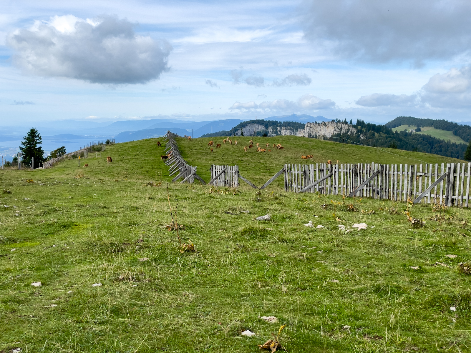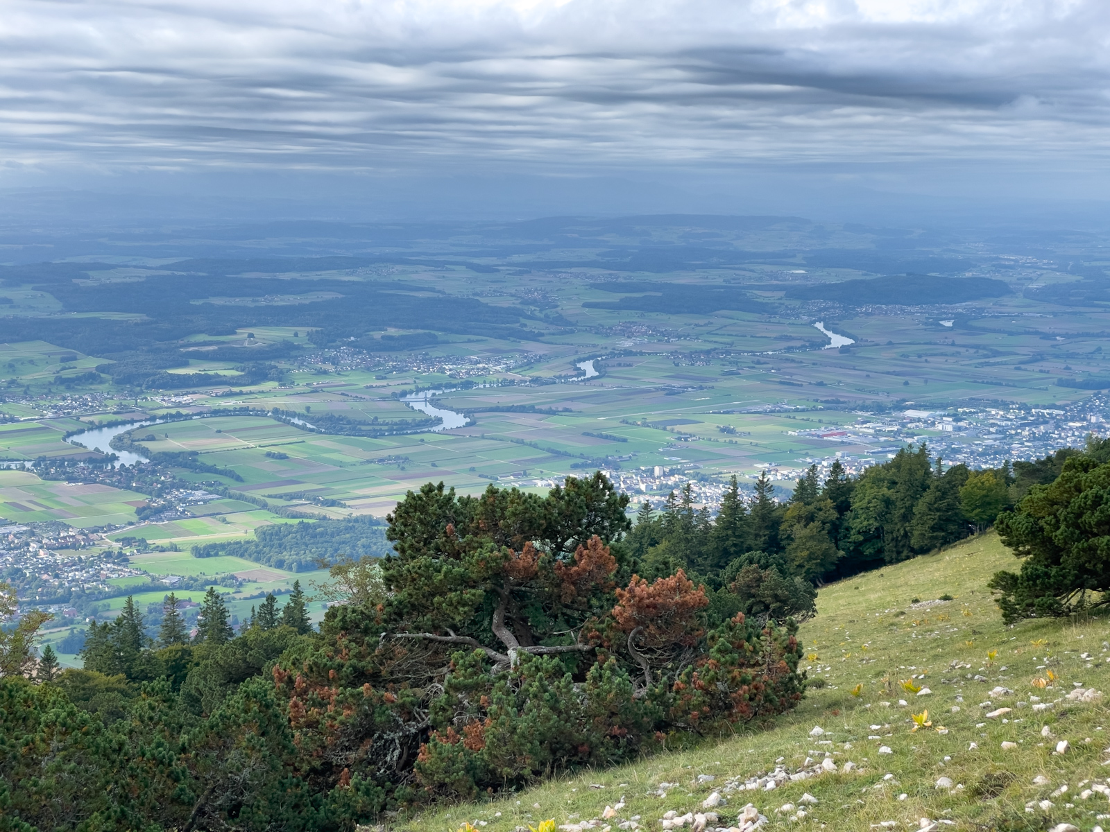 We vervolgen de Jura Crest Trail en het is meteen weer prachtig. Fantastisch uitzicht op de slingerende rivier de Aare door het Mittelland, en in de verte de Bielersee. Een hertje steekt het pad over en we zien roofvogels cirkelen. Na een tijdje komen we in het bos en beginnen we te klimmen. We hebben al gemerkt dat het vooral door de bossen omhoog of omlaag gaat. De bomen groeien op de steile flanken van de rotsachtige bergen. Zodra we over de kam lopen, wordt het meestal wat vlakker en opener, en zijn er vaak mooie uitzichten.