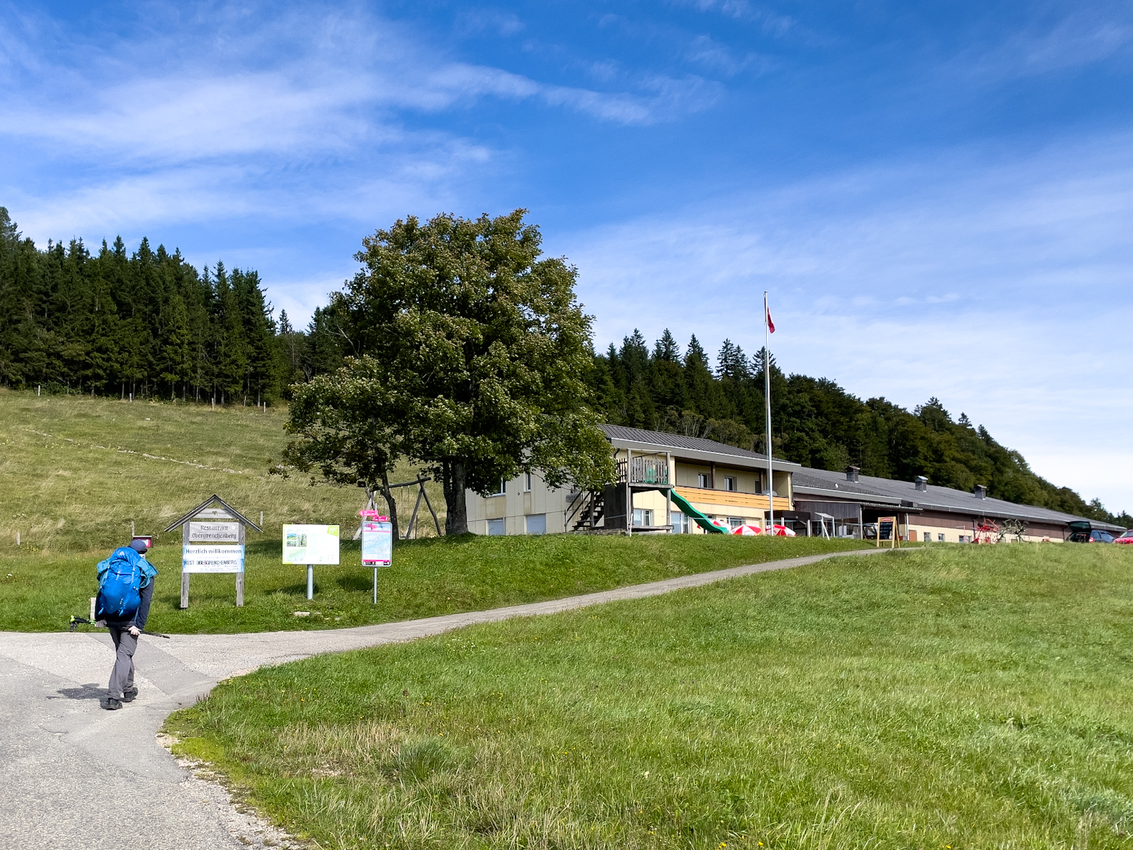 Om kwart voor twaalf zijn we bij Obergrenchenberg, een boerenbedrijf met café. De parasolletjes staan uitnodigend klaar, maar ze hebben weinig in huis en er is geen kaart. We delen de enige gerechten die ze wel hebben. Een Salat en hun allerlaatste portie Maccheroni. Beide met Schinken. We vragen ons af waarom ze al zo vroeg bijna door hun eten heen zijn, maar het smaakt heerlijk.
