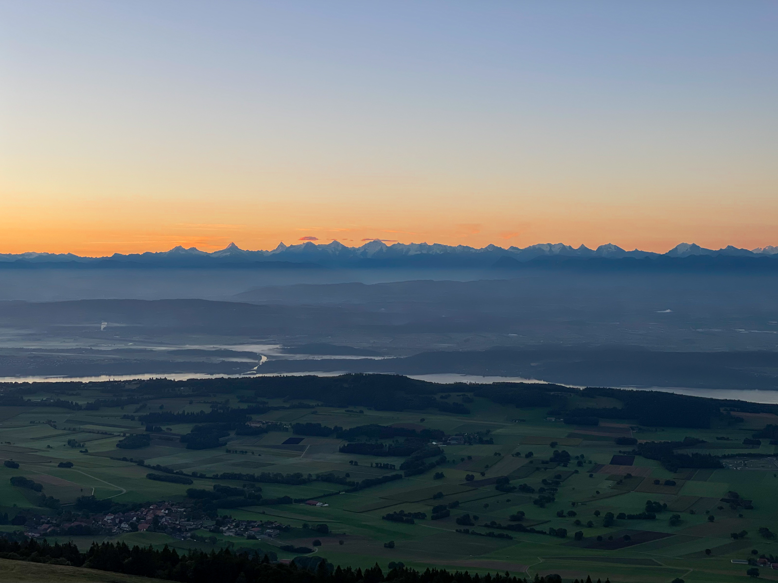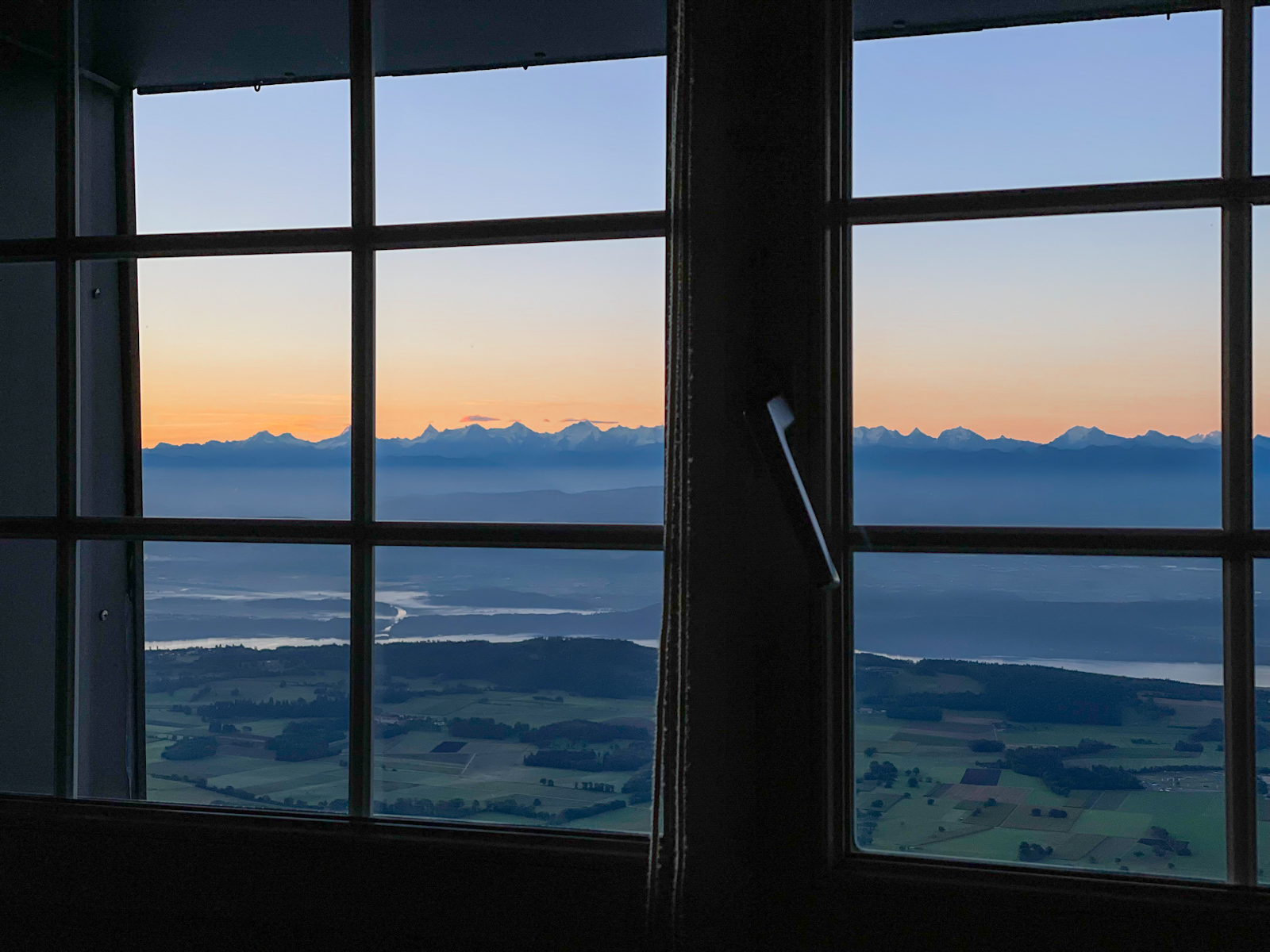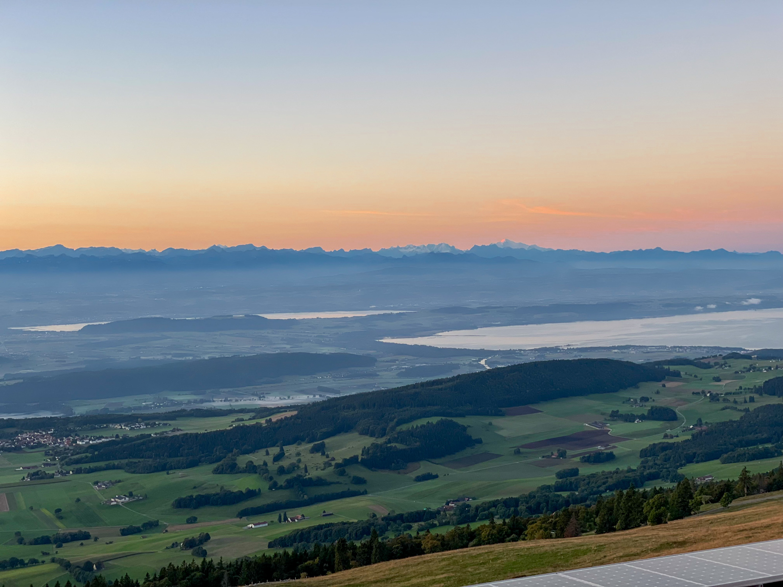 Als we vanmorgen wakker worden, zien we de contouren van de Alpen in een oranje gloed door de opkomende zon. Het uitzicht is hier fantastisch, alleen daarom al een overnachting waard.