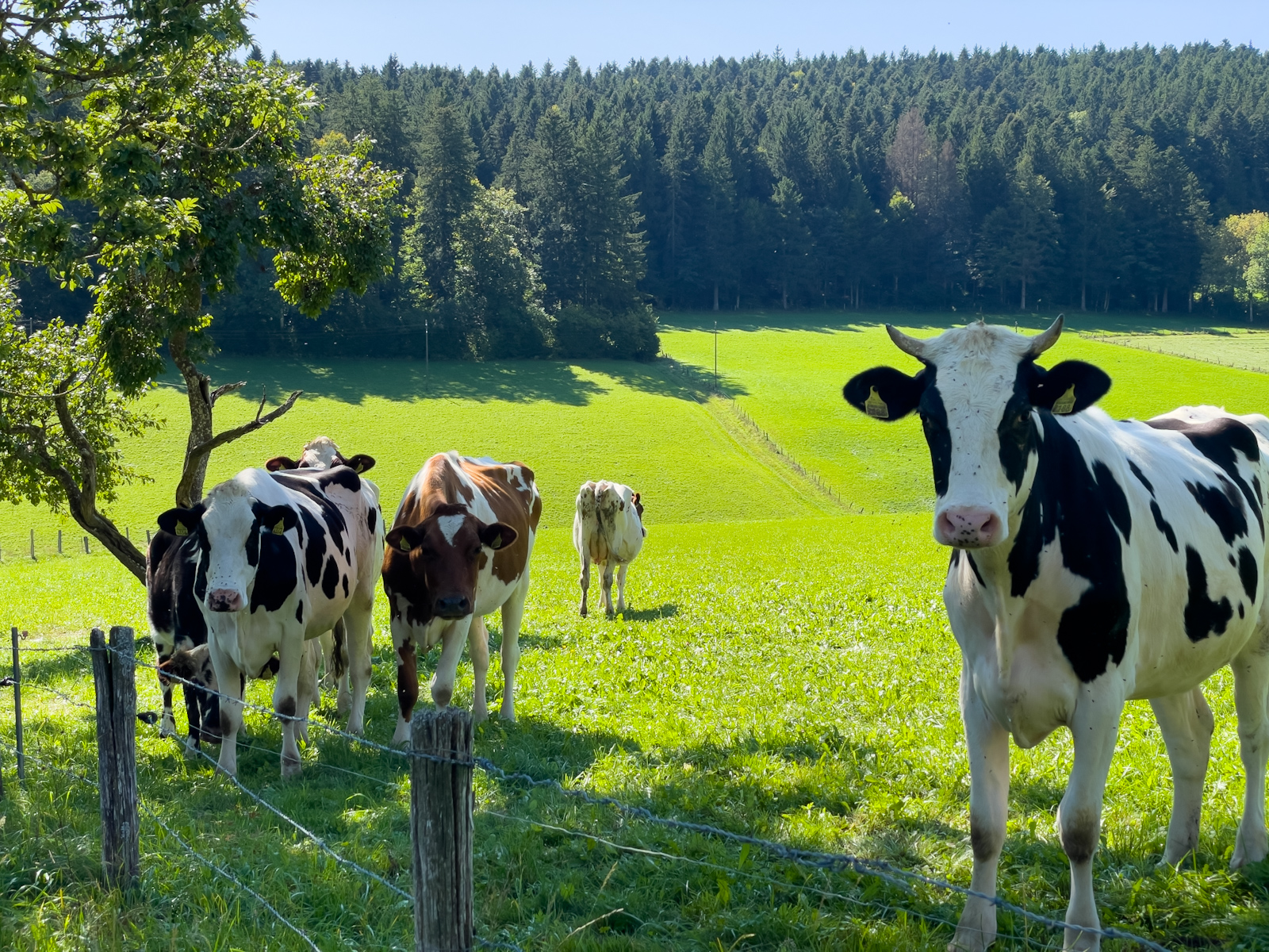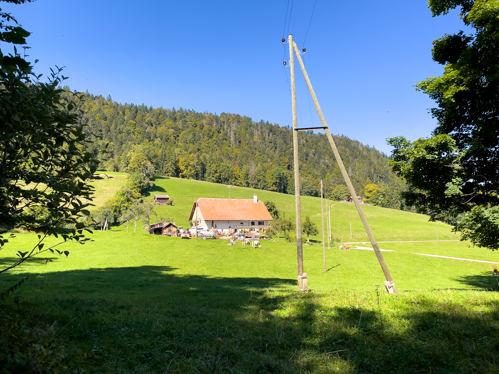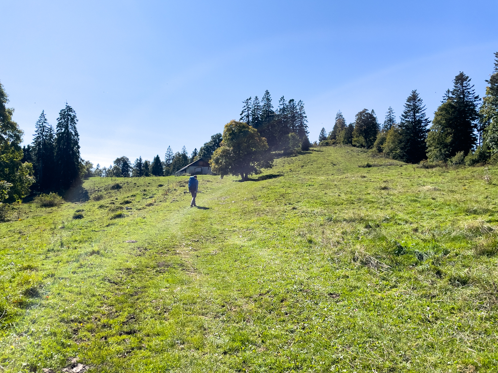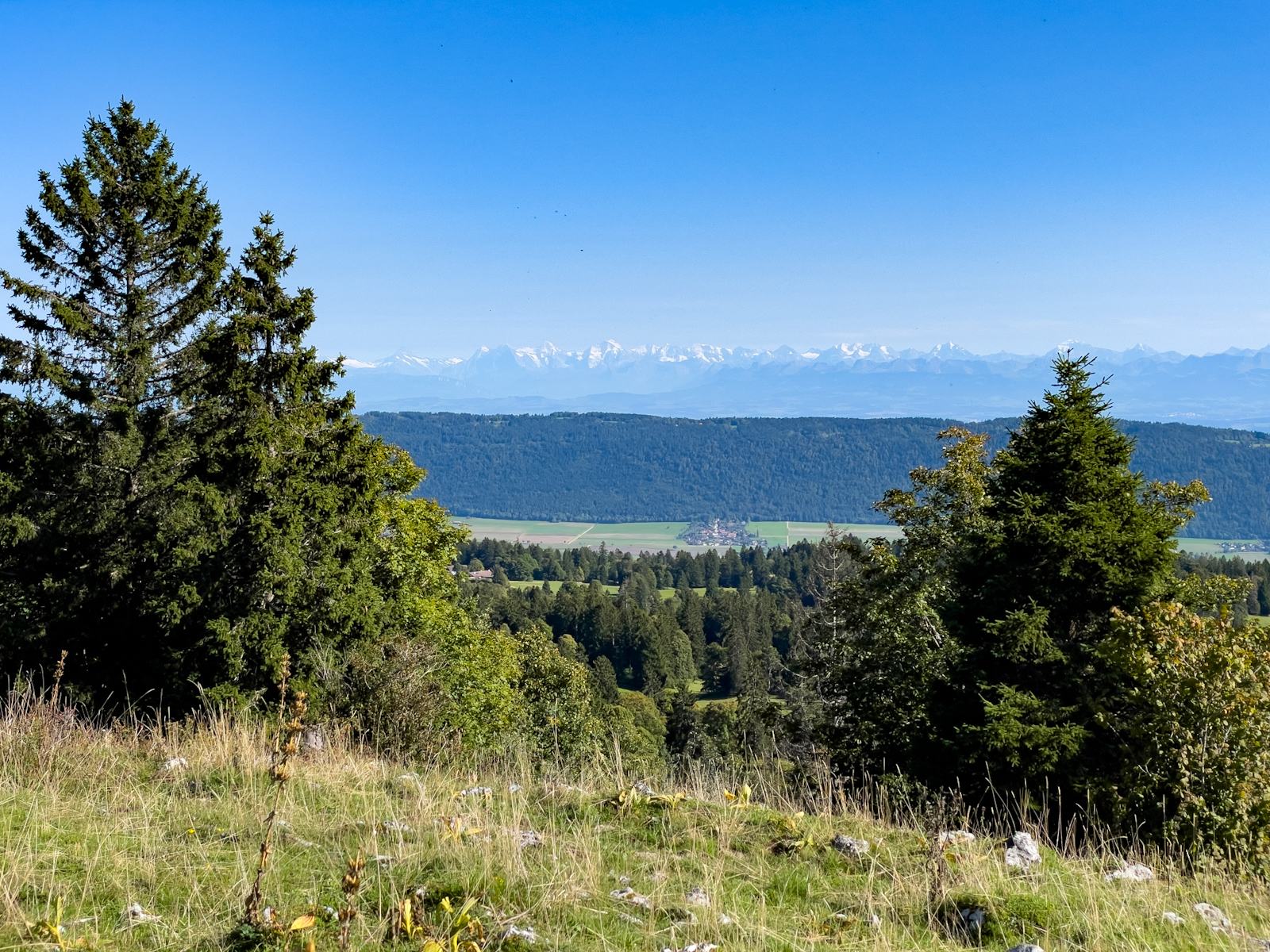 In het Frans aandoende Pâquier lopen we de hoofdstraat in naar Buvette de la Petite Combe voor een kop thee. We delen een lekkere sandwich met lokale kaas en ham. Rond twaalf uur gaat de tocht weer verder, door weilanden en bossen. Een groen en aangenaam landschap. Na enige tijd klimmen we weer flink omhoog. Het landschap wordt ruiger. Op het hoogste punt, Mont d’Amin (1417 m), staat een grote picknicktafel. Er zit al een man, en we vragen of we aan de andere kant kunnen zitten. Al snel raken we in gesprek. De man komt uit La Chaux-de-Fonds, bekend van de horloge-industrie, die door de importtarieven van Trump hard is geraakt. Daarna praten we over de politiek in Nederland, Zwitserland en Europa. De man spreekt redelijk Engels en de Franse woorden tussendoor begrijpen we meestal wel. Een leuke ontmoeting.