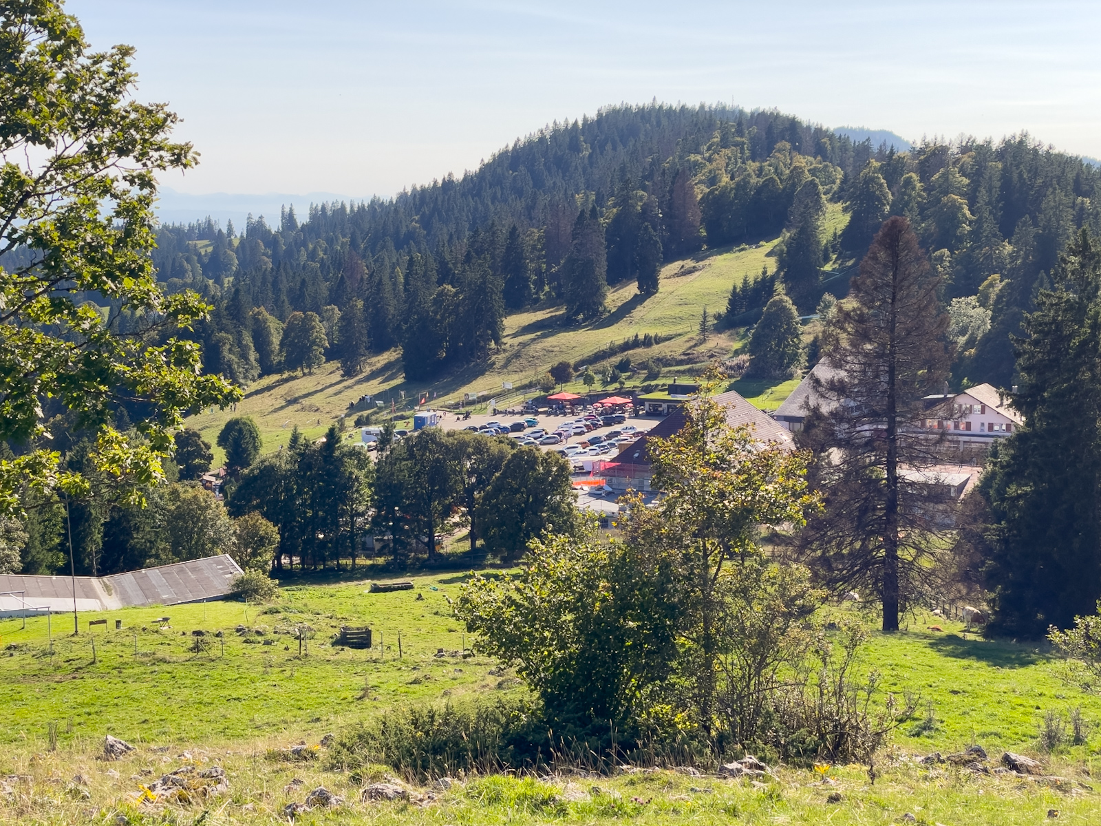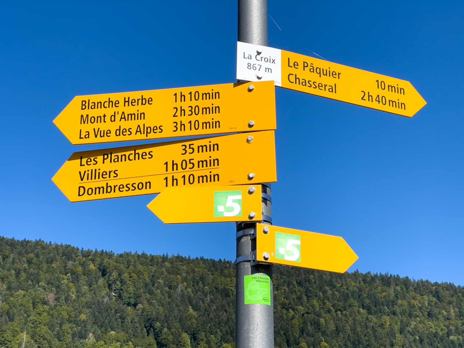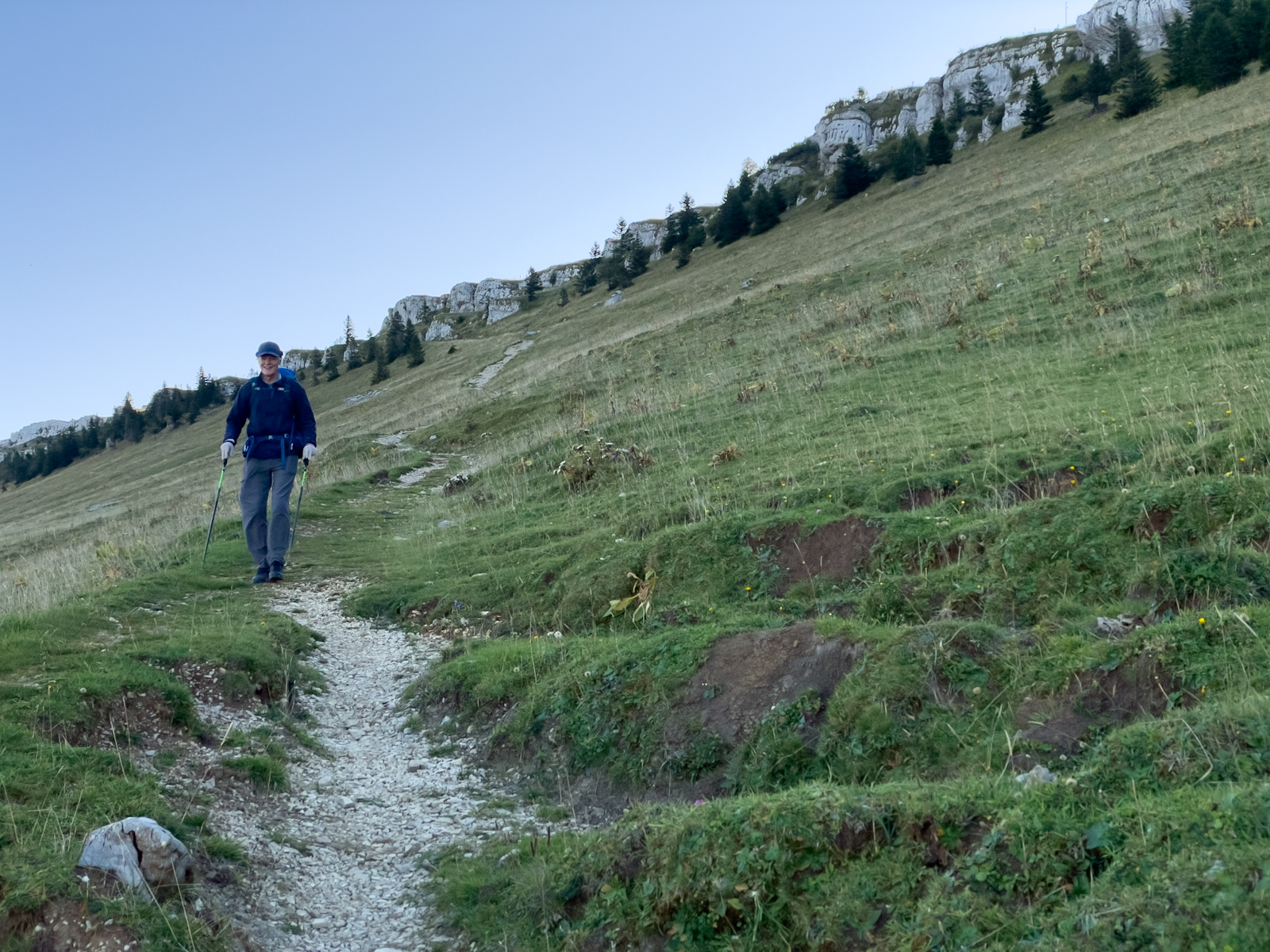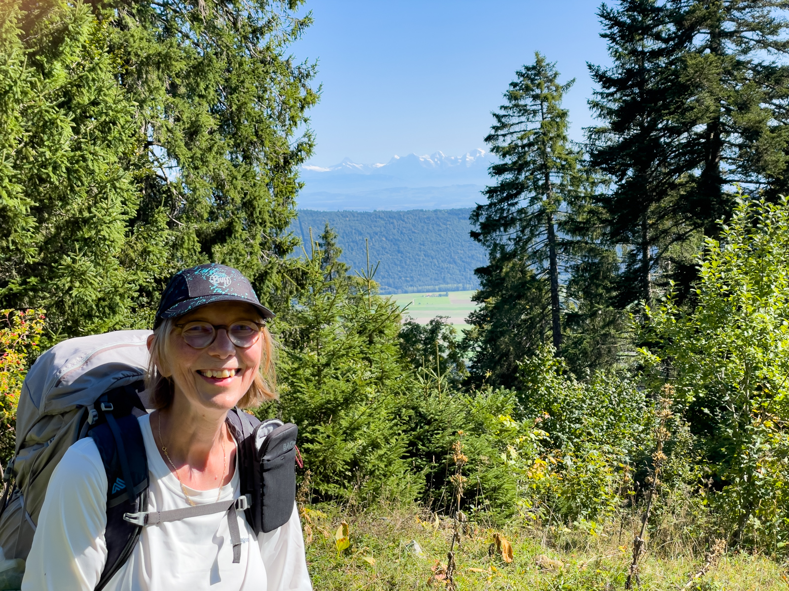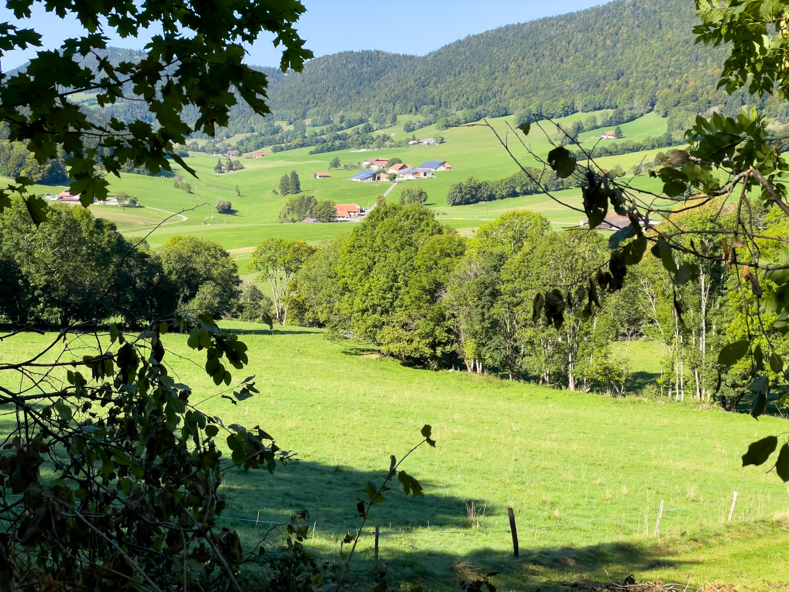 In het Frans aandoende Pâquier lopen we de hoofdstraat in naar Buvette de la Petite Combe voor een kop thee. We delen een lekkere sandwich met lokale kaas en ham. Rond twaalf uur gaat de tocht weer verder, door weilanden en bossen. Een groen en aangenaam landschap. Na enige tijd klimmen we weer flink omhoog. Het landschap wordt ruiger. Op het hoogste punt, Mont d’Amin (1417 m), staat een grote picknicktafel. Er zit al een man, en we vragen of we aan de andere kant kunnen zitten. Al snel raken we in gesprek. De man komt uit La Chaux-de-Fonds, bekend van de horloge-industrie, die door de importtarieven van Trump hard is geraakt. Daarna praten we over de politiek in Nederland, Zwitserland en Europa. De man spreekt redelijk Engels en de Franse woorden tussendoor begrijpen we meestal wel. Een leuke ontmoeting.