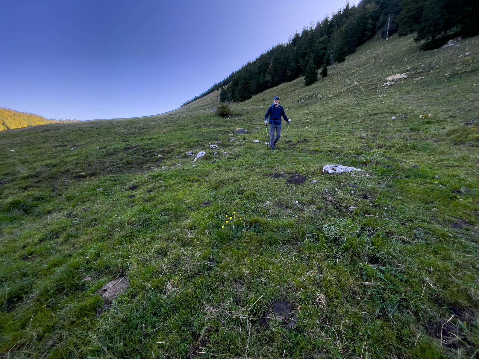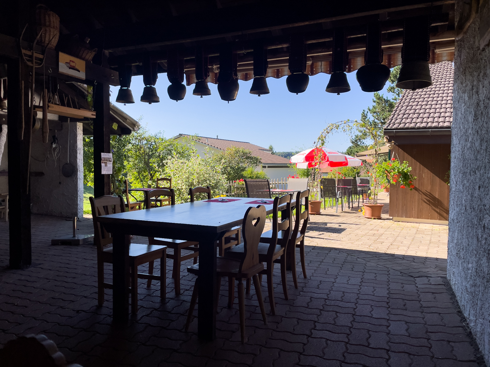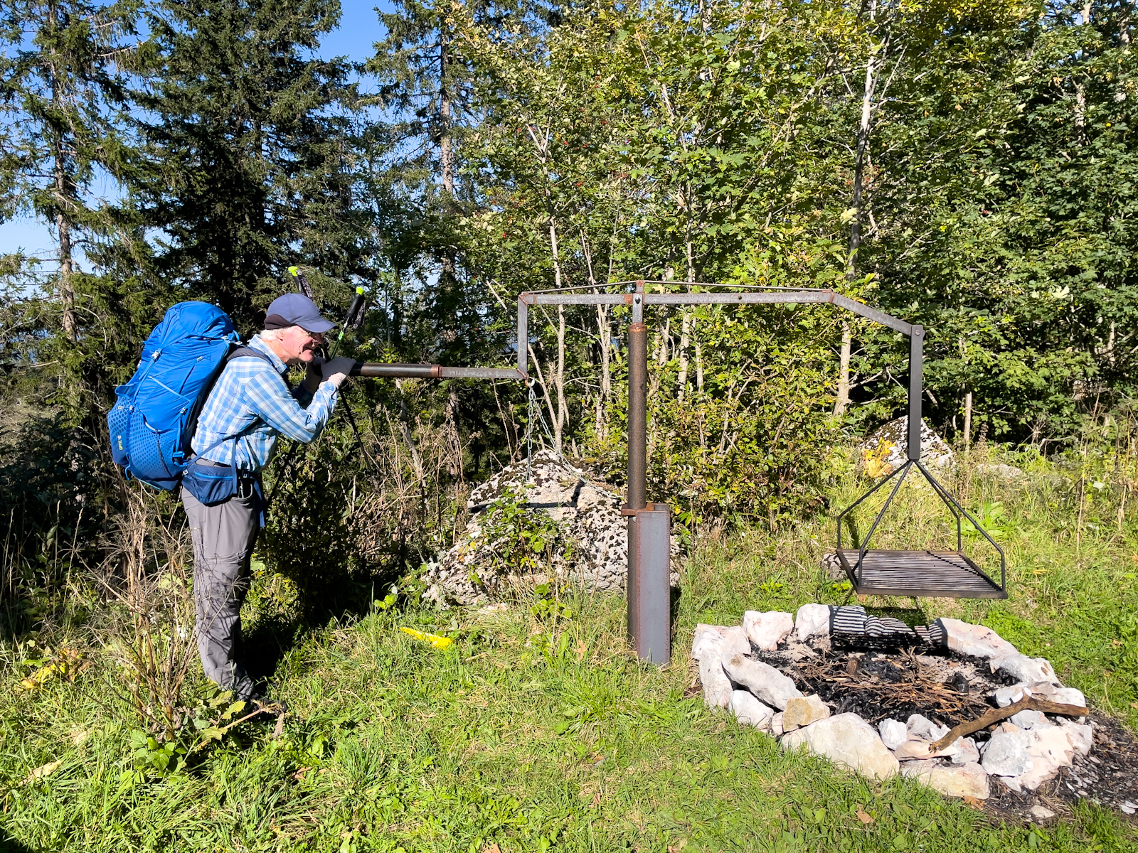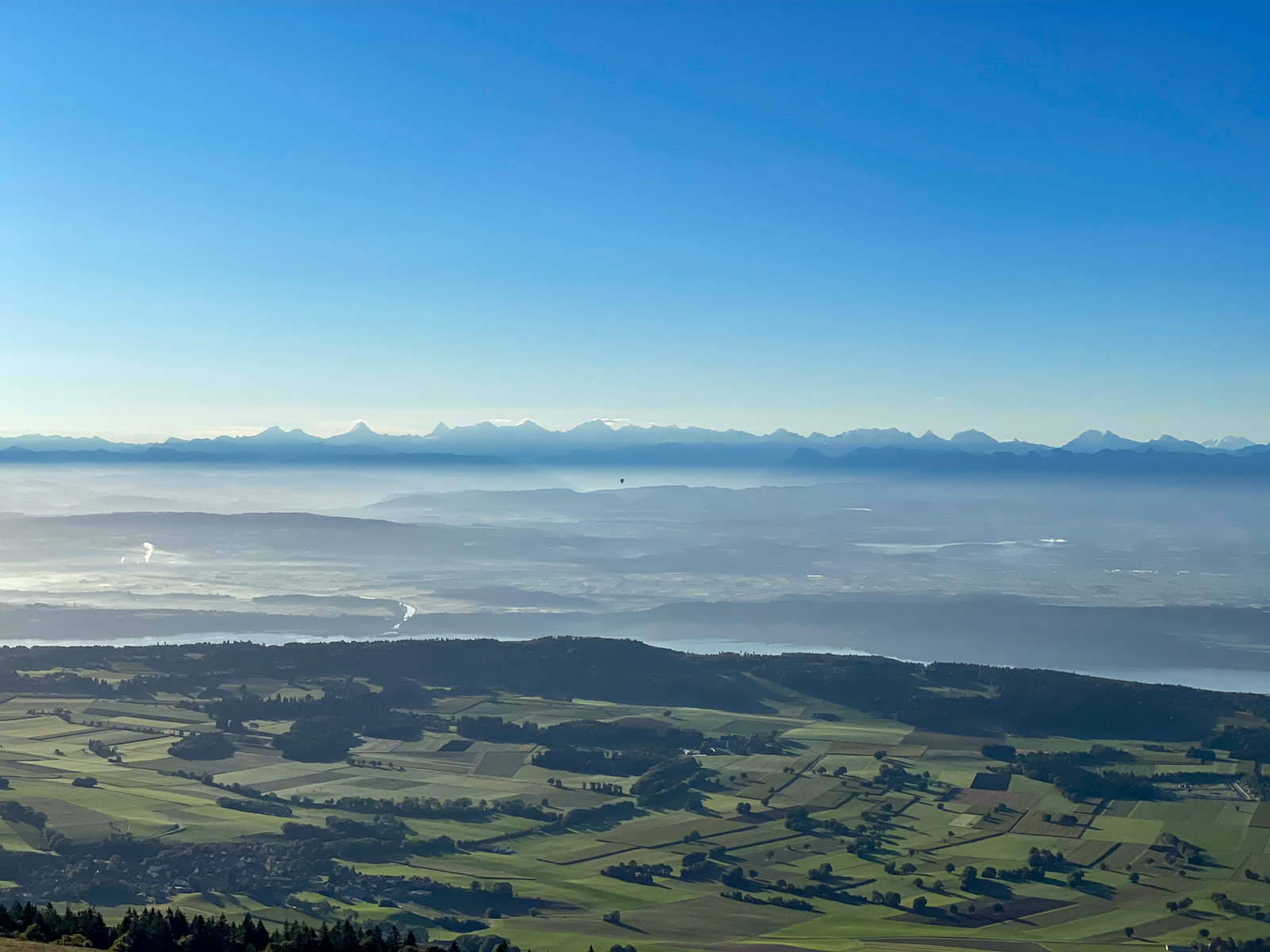 In het Frans aandoende Pâquier lopen we de hoofdstraat in naar Buvette de la Petite Combe voor een kop thee. We delen een lekkere sandwich met lokale kaas en ham. Rond twaalf uur gaat de tocht weer verder, door weilanden en bossen. Een groen en aangenaam landschap. Na enige tijd klimmen we weer flink omhoog. Het landschap wordt ruiger. Op het hoogste punt, Mont d’Amin (1417 m), staat een grote picknicktafel. Er zit al een man, en we vragen of we aan de andere kant kunnen zitten. Al snel raken we in gesprek. De man komt uit La Chaux-de-Fonds, bekend van de horloge-industrie, die door de importtarieven van Trump hard is geraakt. Daarna praten we over de politiek in Nederland, Zwitserland en Europa. De man spreekt redelijk Engels en de Franse woorden tussendoor begrijpen we meestal wel. Een leuke ontmoeting.