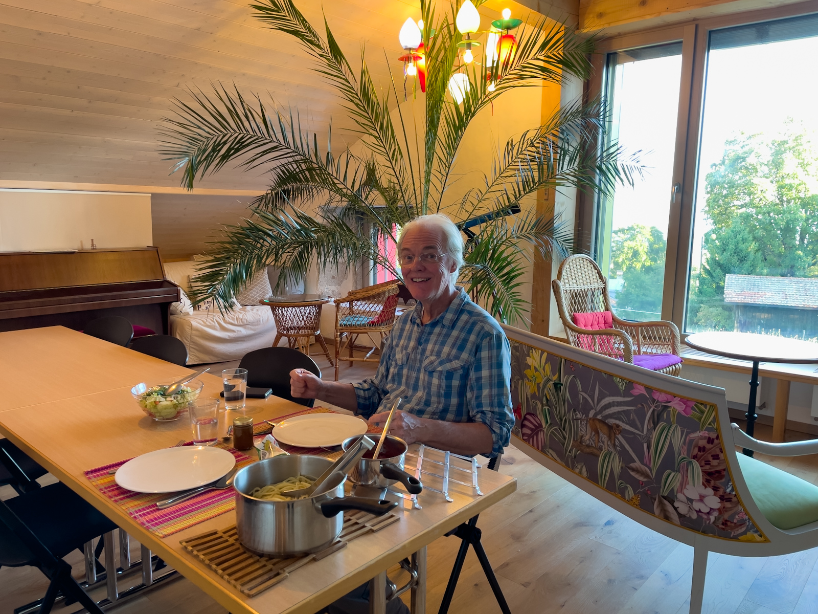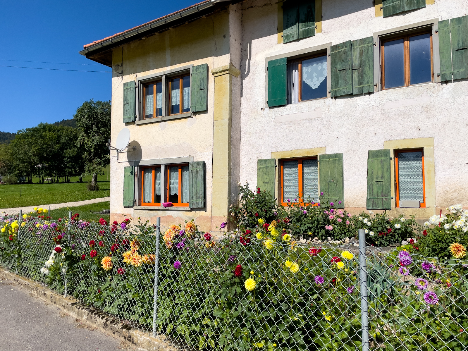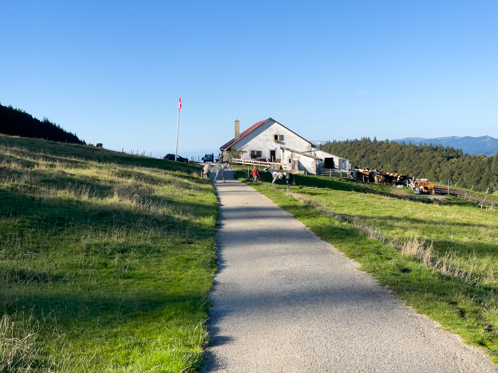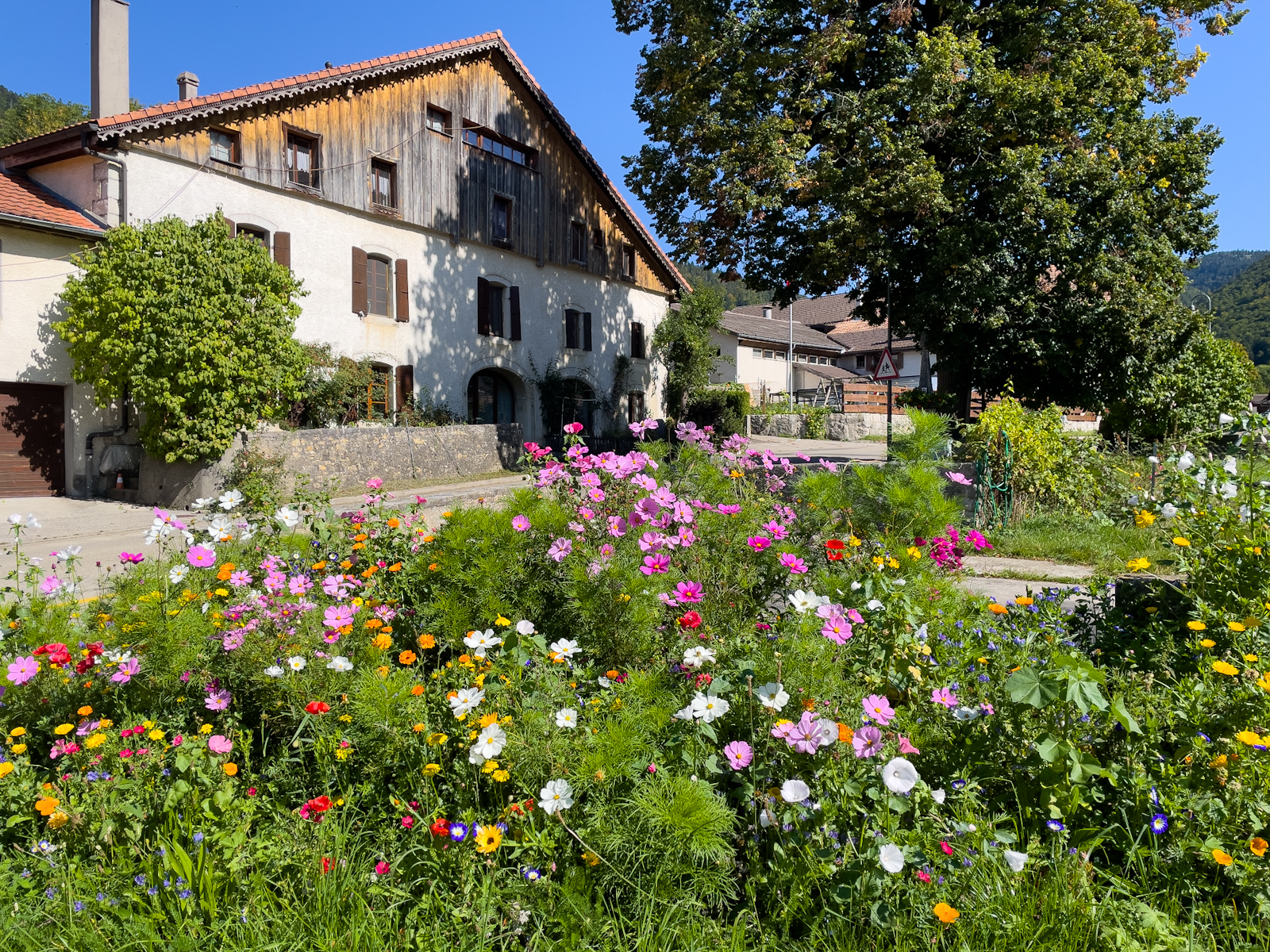 We lopen verder naar het drukke La Vue des Alpes: een grote parkeerplaats op het hoogste punt van een doorgaande weg, met uitzicht op de Alpen. Ons logeeradres blijkt nog een kilometer verder te liggen en 75 meter lager, in het gehucht Les Loges.