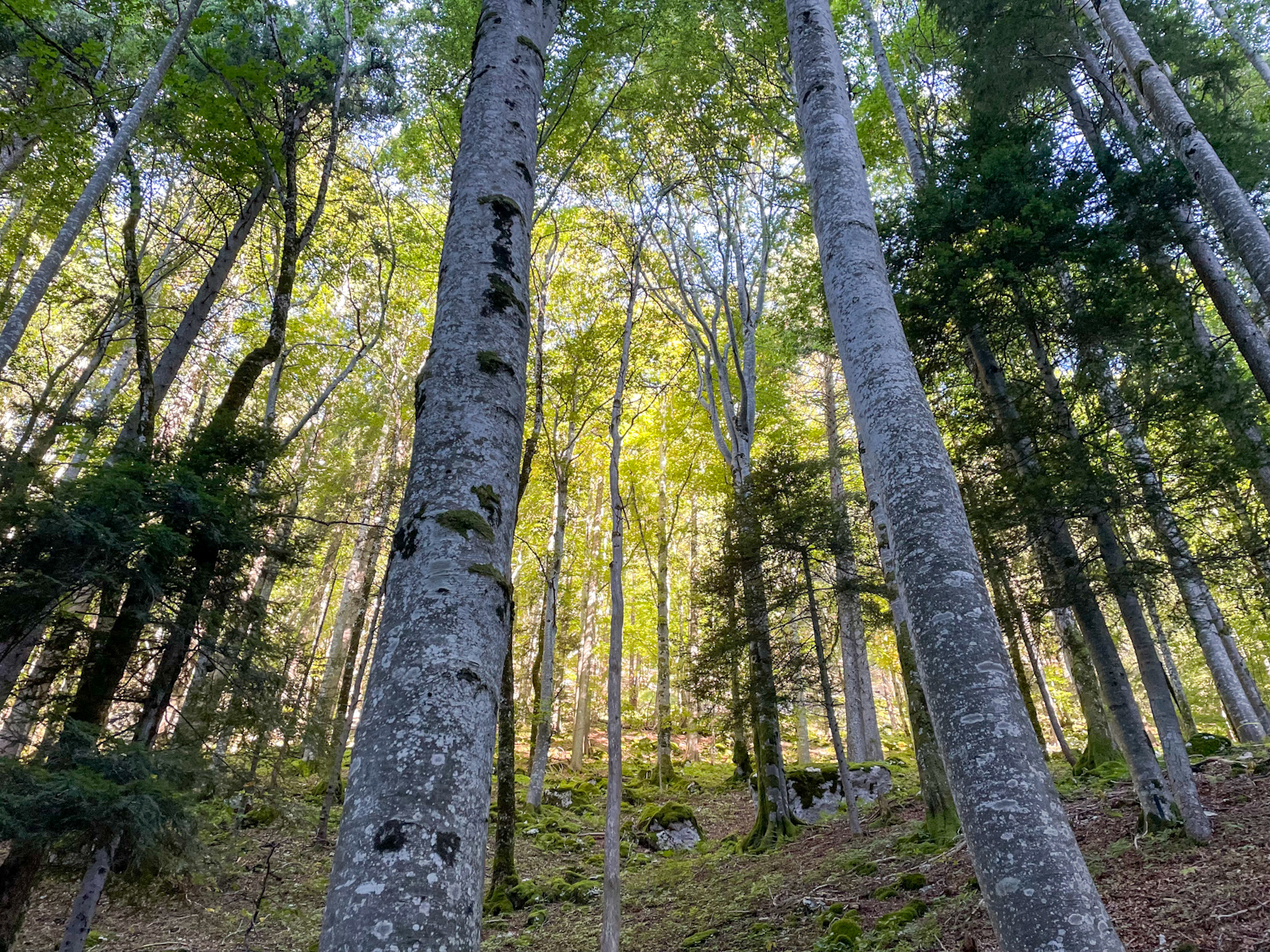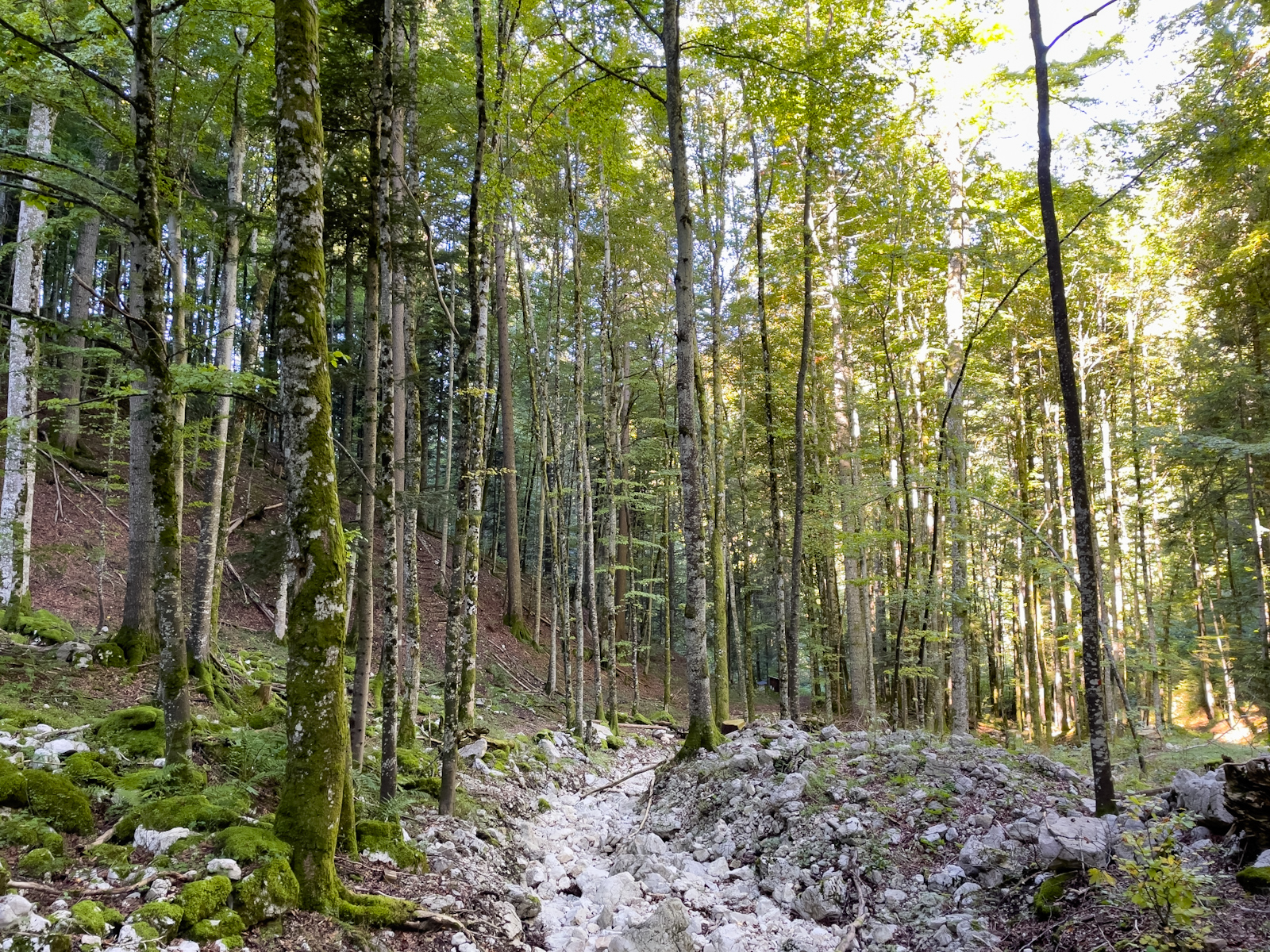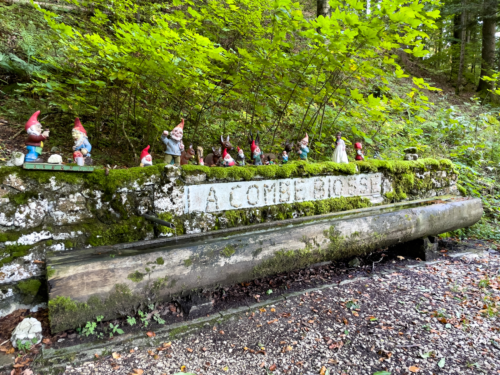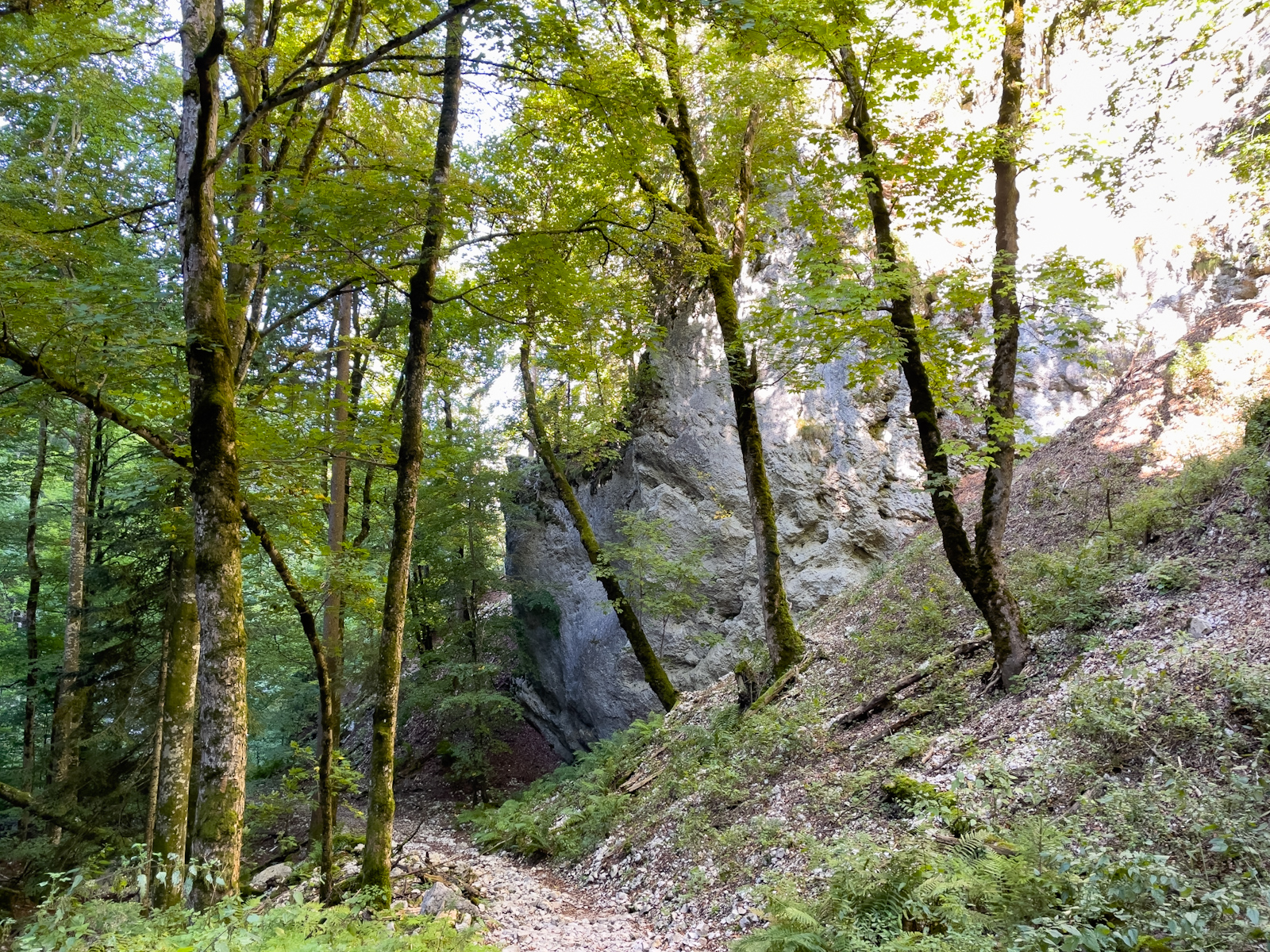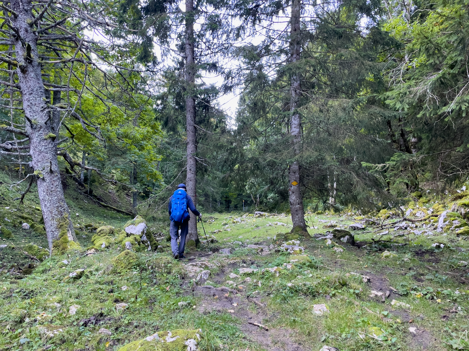Na het uitstekende ontbijt vertrekken we rond kwart voor negen. We dalen van 1600 meter hoogte naar het plaatsje Le Pâquier op 900 meter hoogte. Daar zijn we wel even mee zoet. Aanvankelijk lopen we door een meer open gebied, later door een beboste kloof met aan weerszijden steile hellingen, soms ook rotsig. Het pad is lastig, met veel puntige stenen.