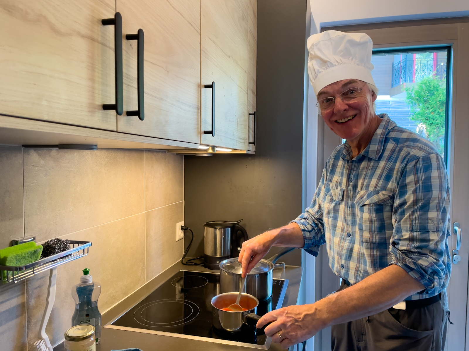 We slapen in een bed & breakfast (chambres d’hôtes), in een mooie nieuwe kamer met douche. Er is ook een moderne gemeenschappelijke keuken en woonkamer. We kunnen wat spaghetti, een potje saus en een zakje kaas kopen om een avondmaaltijd te bereiden. De vrouw des huizes maakt er voor ons ook nog een salade bij. Prima geregeld.