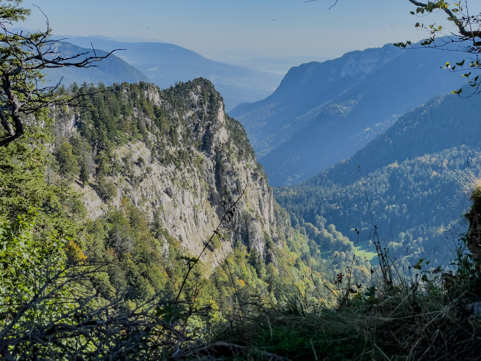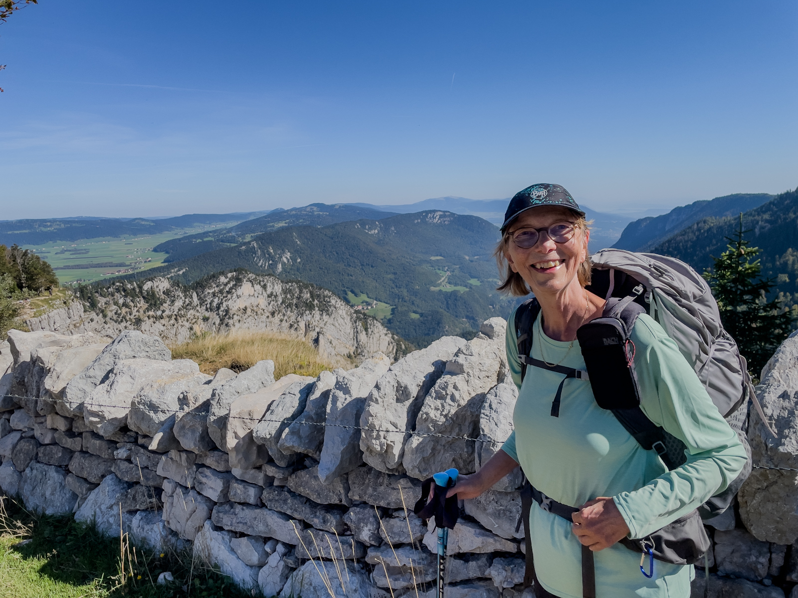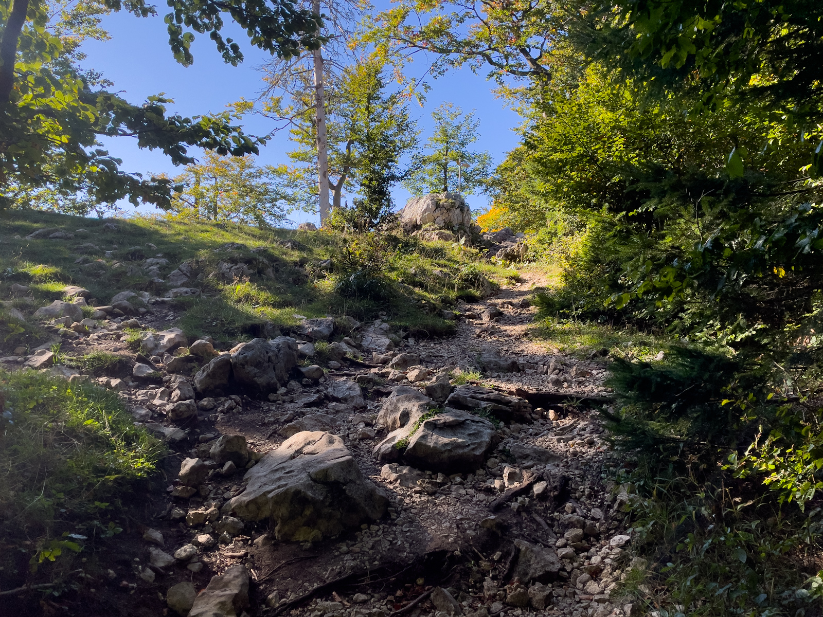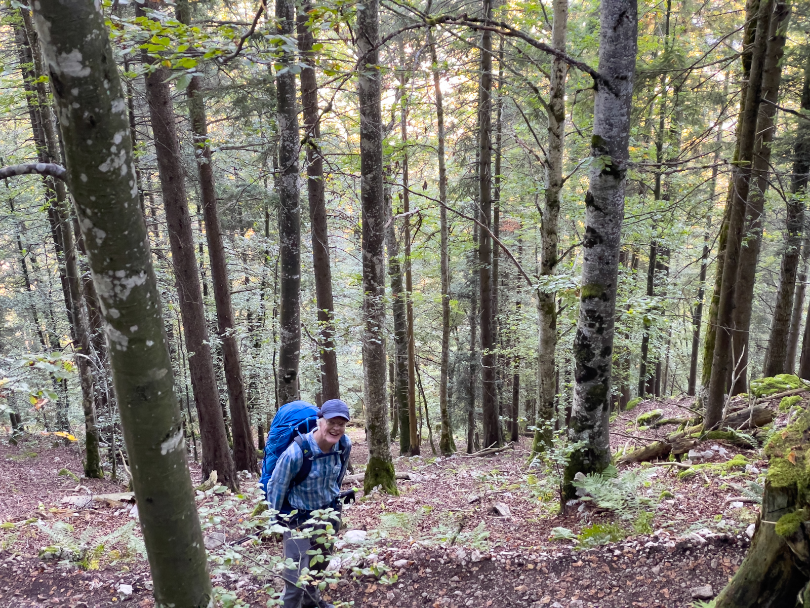 De afgelopen dagen zijn we heel weinig andere wandelaars tegengekomen. Vanmorgen (zaterdag) is het duidelijk drukker. Het is een enorme klim door het bos naar de rand van de Creux-du-Van. Halverwege komen we langs een cafeetje (we stoppen hier nog niet). Daarna volgt het steilste gedeelte: een rotsig pad met veertien haarspeldbochten. Eigenlijk klimt dat best prettig, omdat je kunt meetellen. Bovendien wordt de afstand tussen de bochten steeds kleiner naarmate je hoger komt. Grappig, de psychologie van het klimmen.