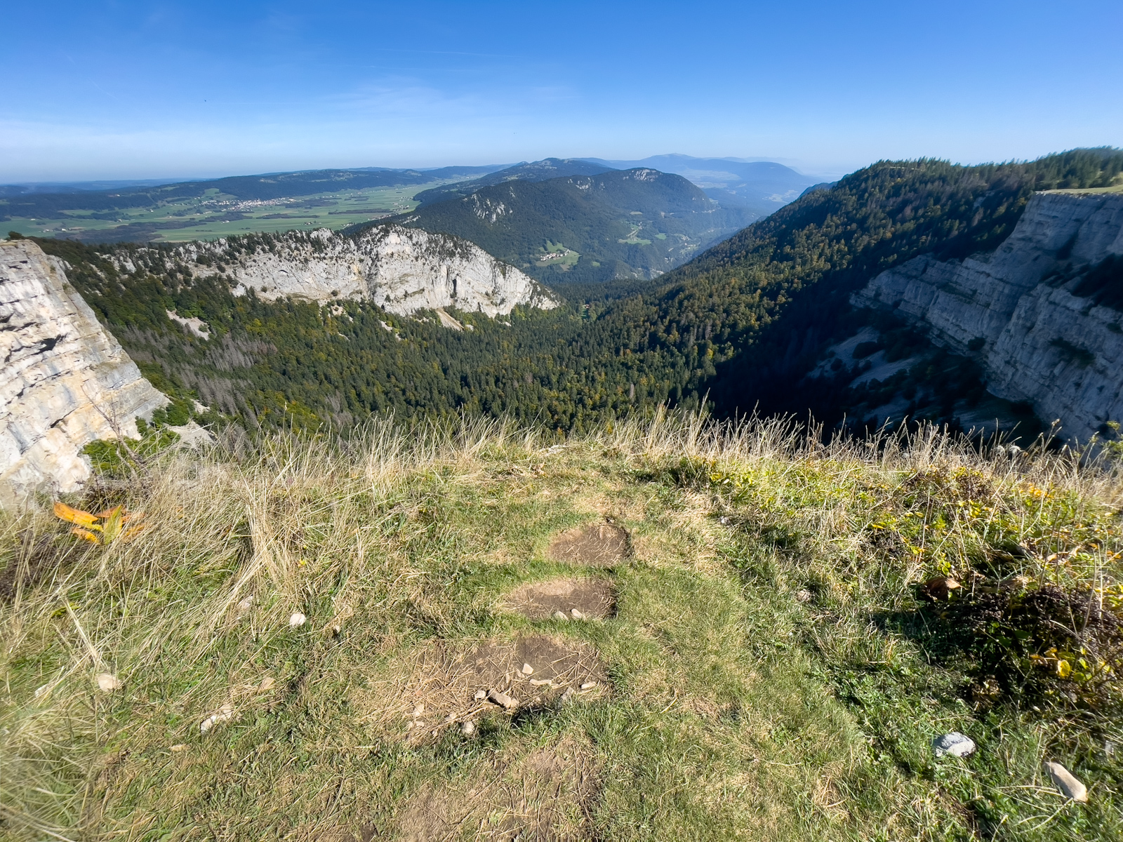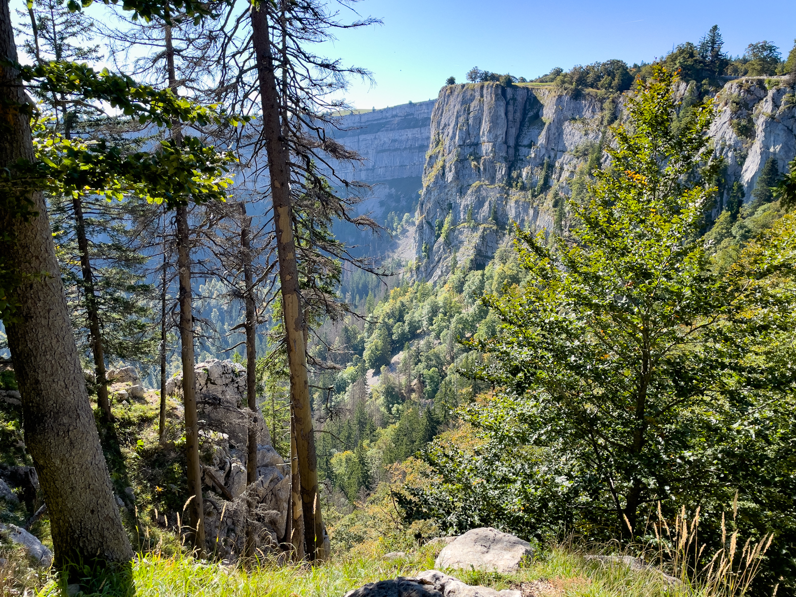 Om elf uur zijn we bij de Creux-du-Van. We lopen een stuk langs de rand en proberen de grootsheid op de foto te krijgen. Lastig met een telefoon, en de zon staat eigenlijk ook niet goed. De enorme rotswanden vallen loodrecht naar beneden. Er zijn muurtjes van stenen en ook prikkeldraad om te voorkomen dat mensen te dicht bij de rand komen.