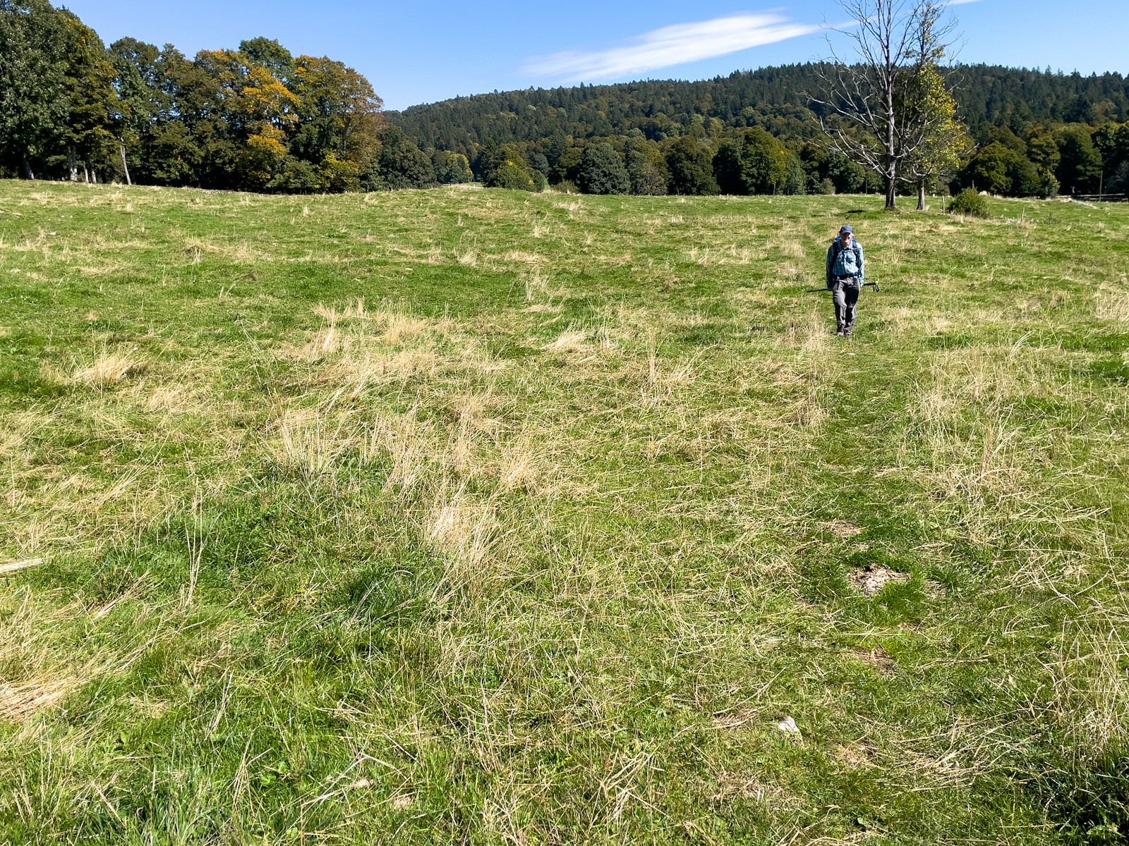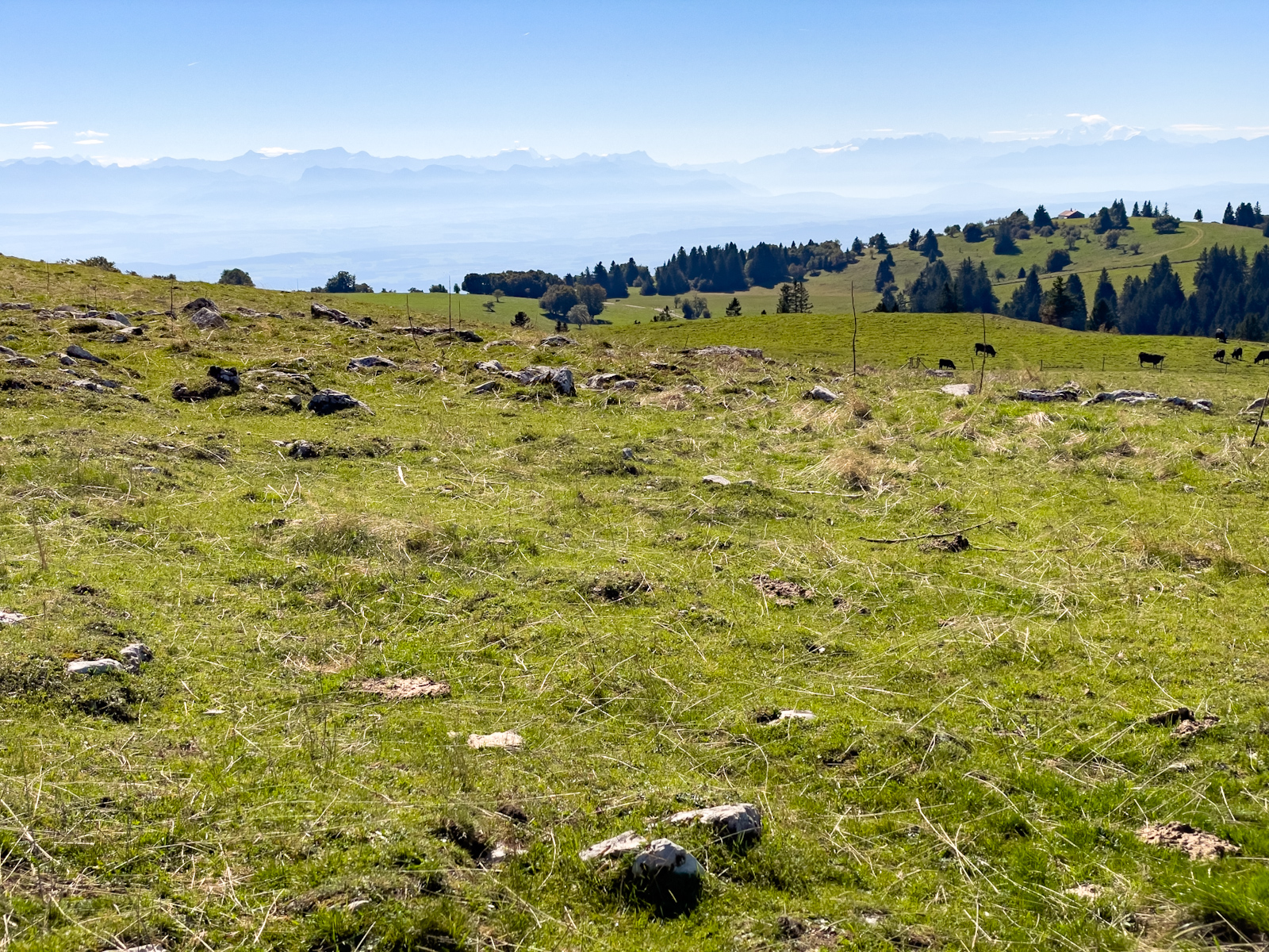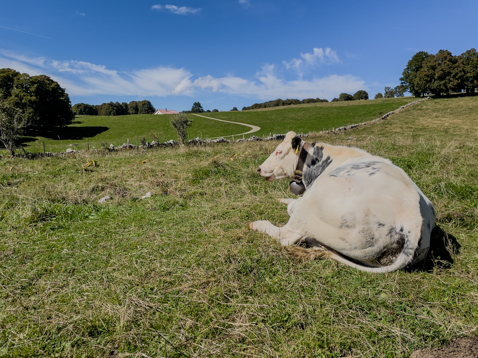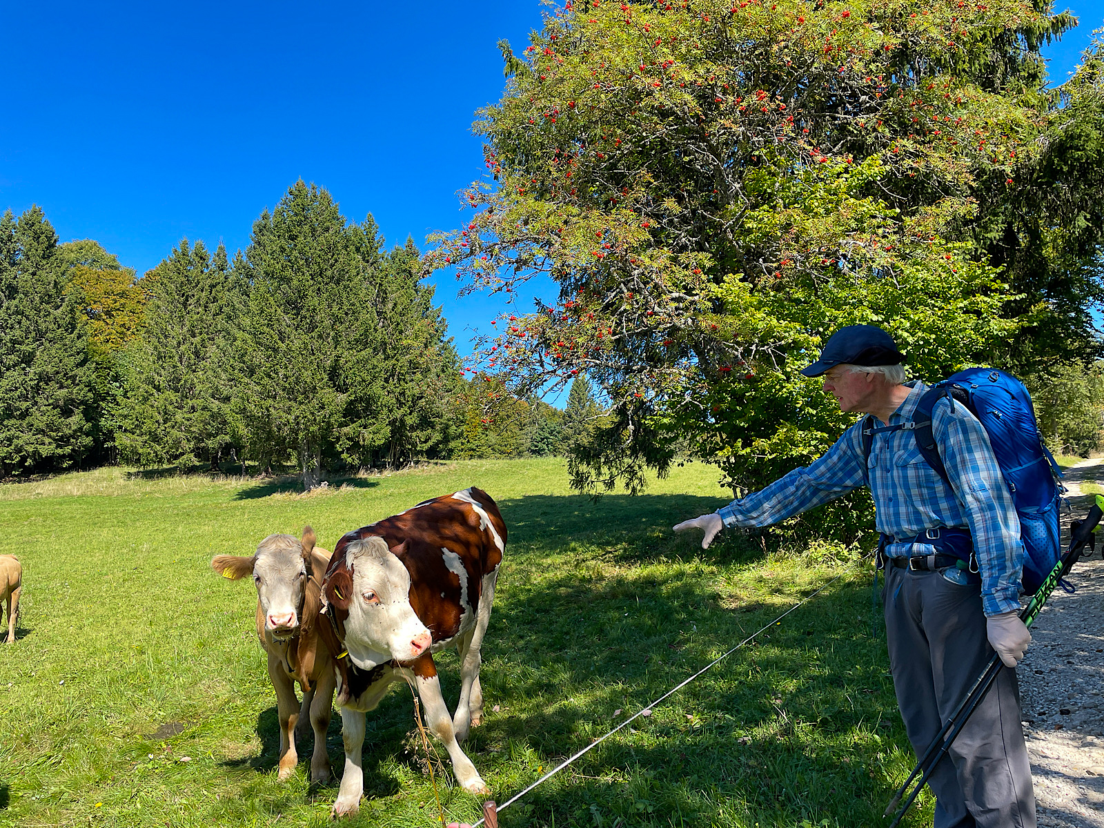 We volgen de route nog een stukje verder omhoog langs de Creux-du-Van en daarna buigt de Jura Crest Trail af. Meteen is het een stuk rustiger. We dalen af door een weiland en op het moment dat ik even achterom kijk waar Chris blijft, zie ik plots achter hem een enorme zwarte stier recht op hem afstormen. O nee! Ik roep en zwaai met beide wandelstokken, groot en dreigend, in een poging de stier af te schrikken. Chris draait zich om en richt zijn stokken op de stier en probeert hem weg te jagen. Het lukt. De stier buigt af maar rent, nog steeds wild, richting de wandelaars voor ons. Die maken ook wilde gebaren en dan kiest het beest het hazepad en galoppeert weg, Wow, dat was best spannend.