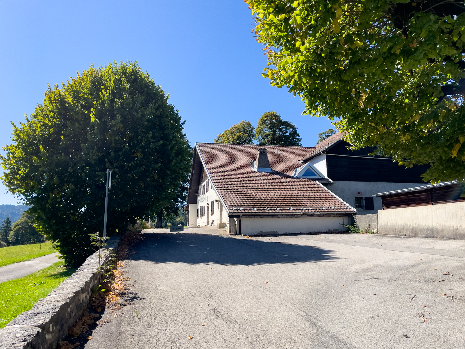 Hierna wordt de wandeling weer een stuk rustiger. Een mooie groene omgeving, door velden en bossen. Soms een stukje asfalt. Het gaat wat omhoog of omlaag, maar lang niet zo steil als vanmorgen. We komen langs het grote verwaarloosde gebouw van Les Rochats. Vroeger kon je hier eten en slapen. Maar het is nu definitief gesloten. Voor wandelaars van de Jura Crest Trail een gemis, want het is heel lastig om hier een overnachtingsplek te vinden.
