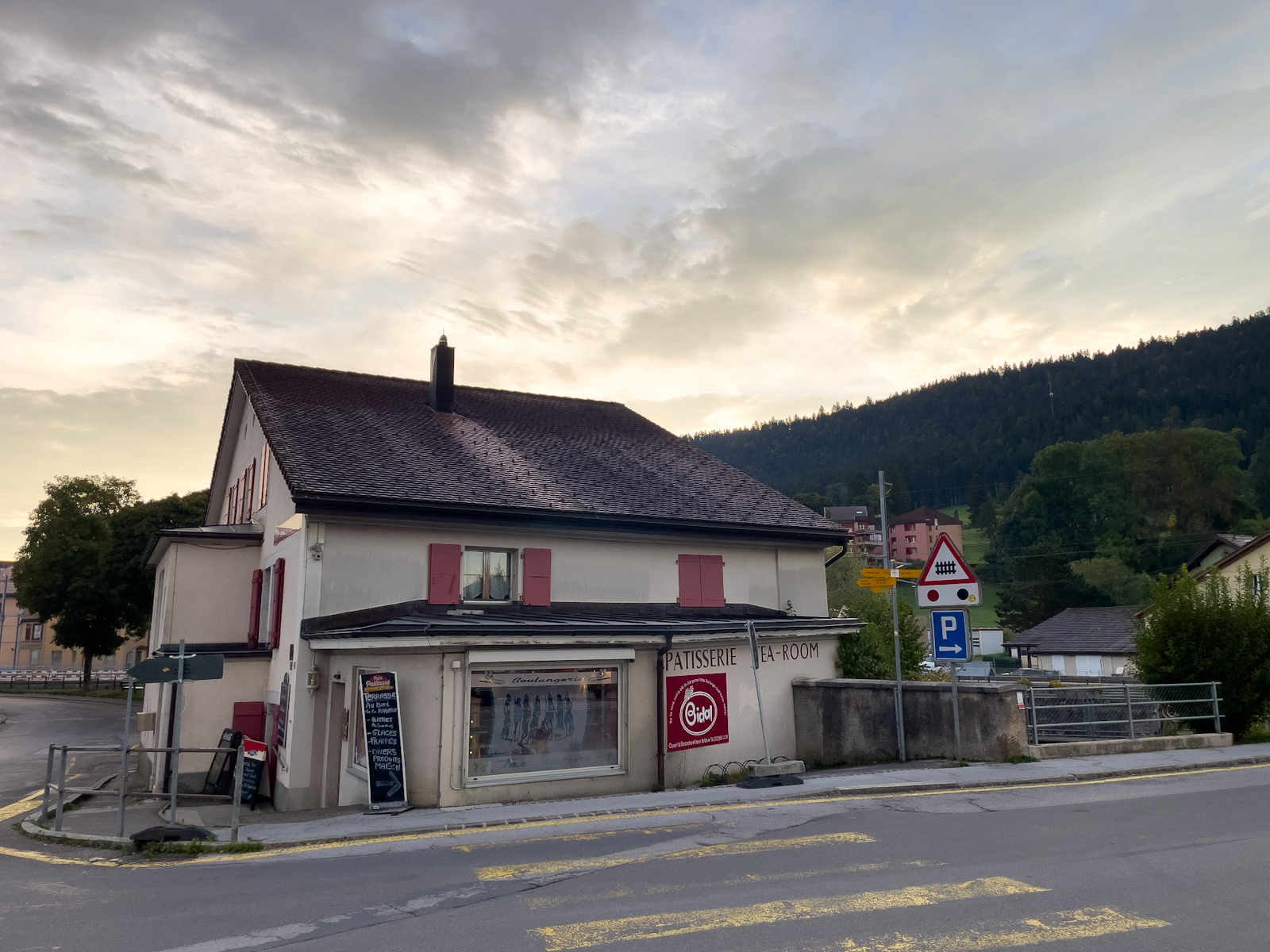 We lopen door de stille straten van Couvet naar de bakker, waar ze achter de winkel een kleine tearoom hebben (Bidal Boulangerie Pâtisserie Tea-Room Sàrl). Hier bestellen we een ontbijt met verse broodjes. Het voelt heel Frans aan. Een man naast ons leest de krant bij een kopje koffie met een croissant.