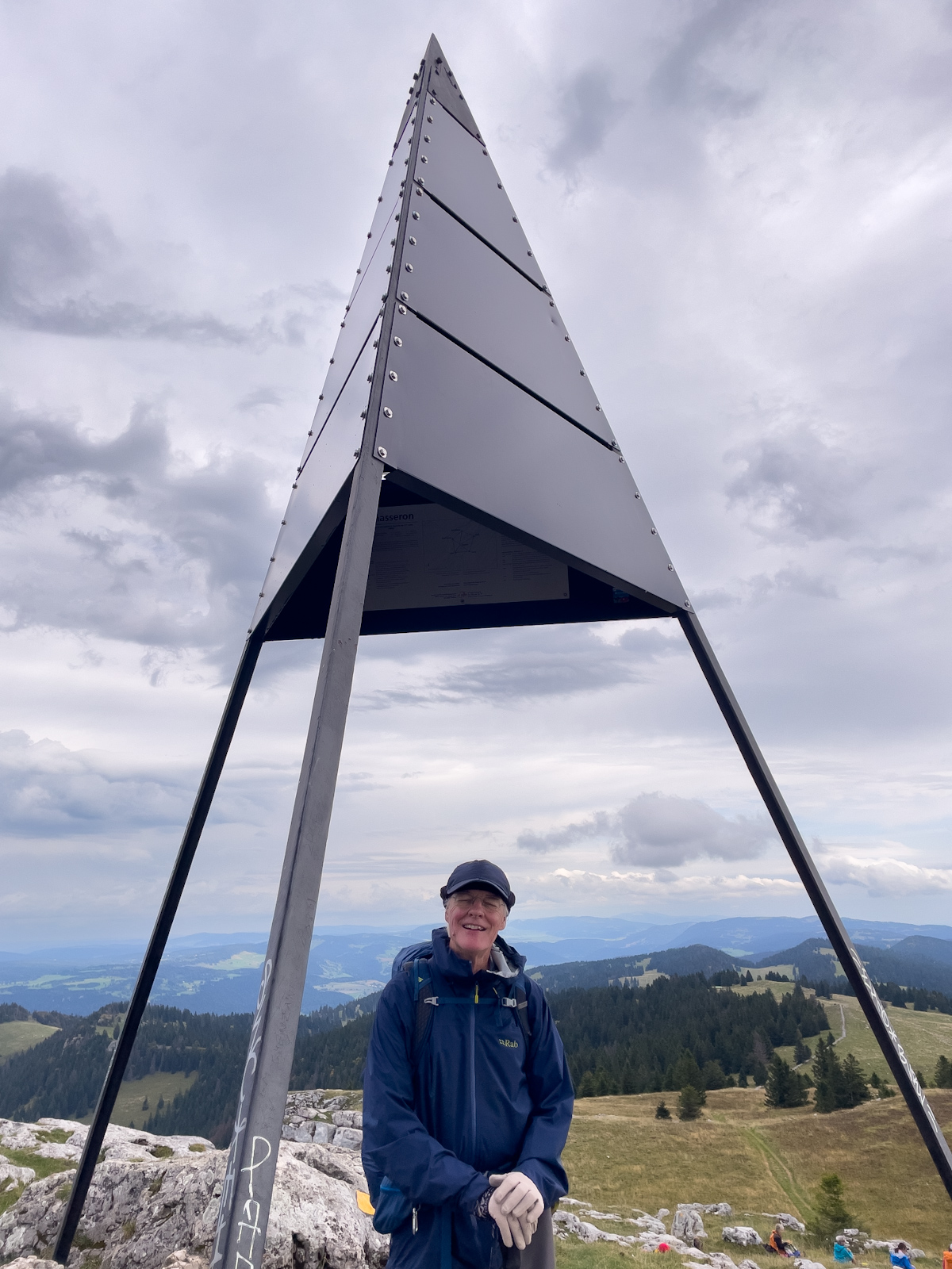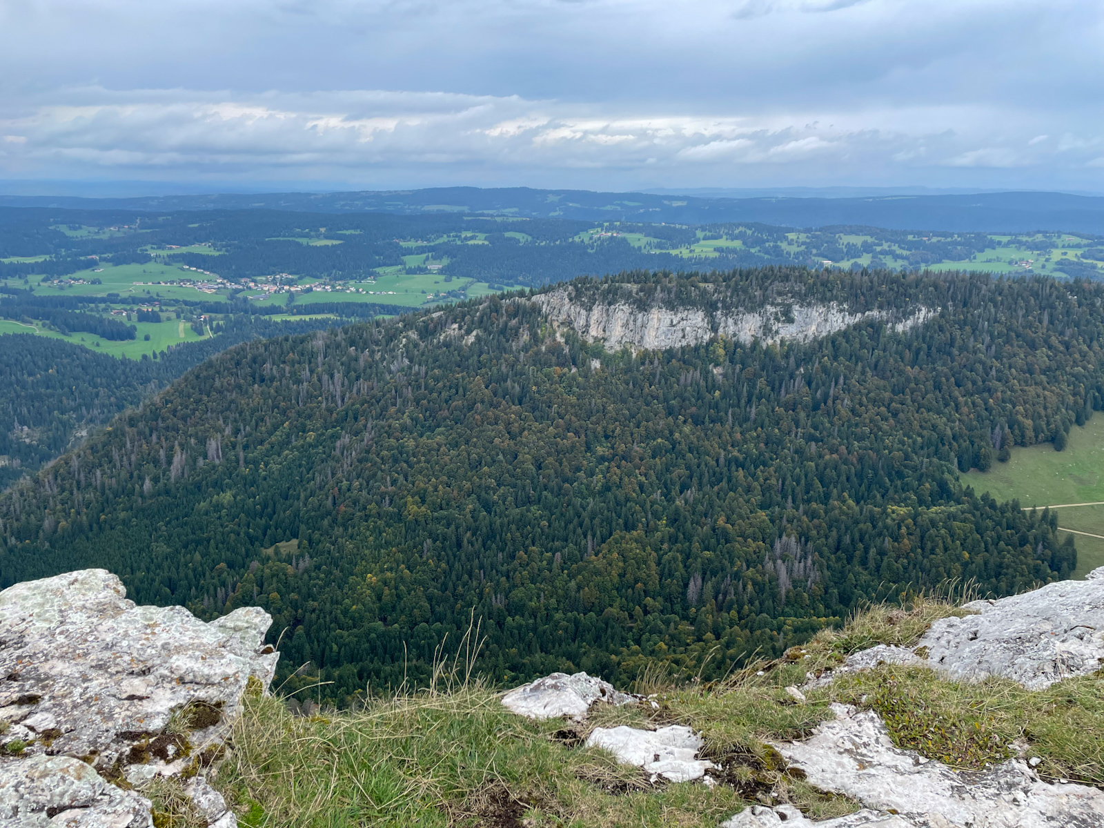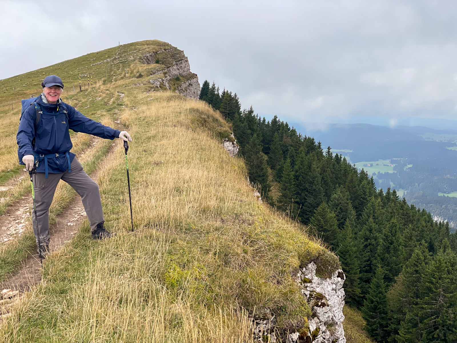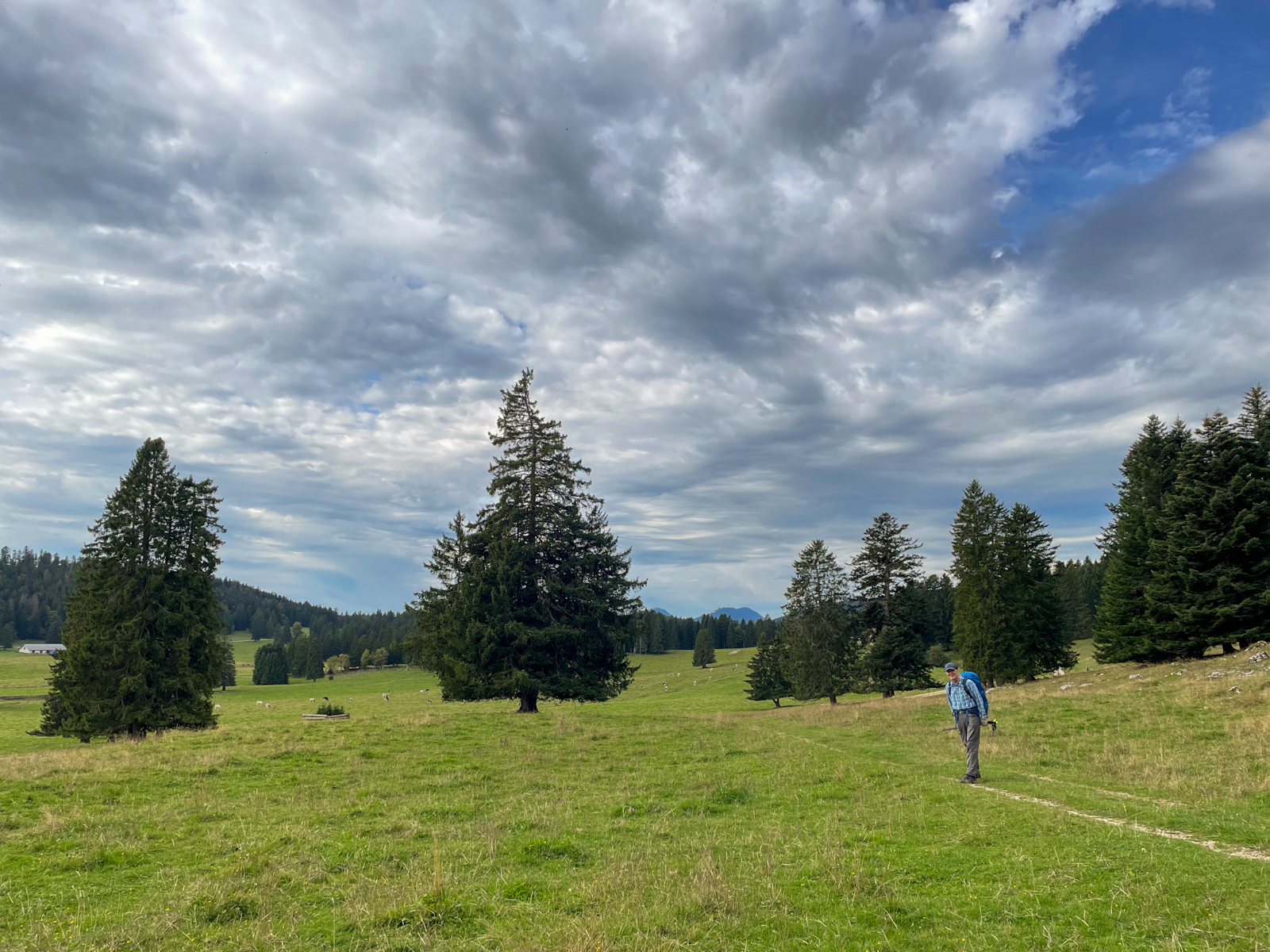 De klim naar de top gaat ons inmiddels best goed af. Dat komt mede omdat een groot deel over open hellingen loopt. Een prachtig landschap, en wat zijn er in de Jura toch veel schitterende vrijstaande bomen. Het gebel van de koeien draagt ook bij aan de sfeer.