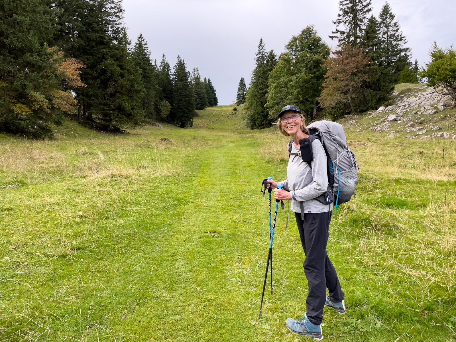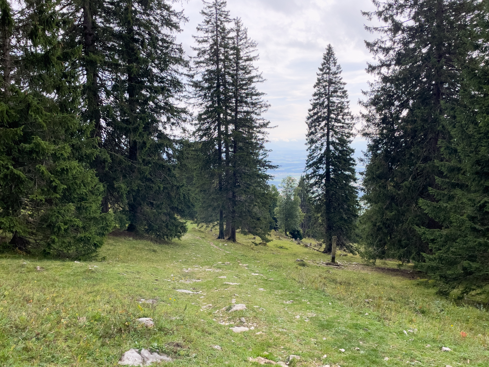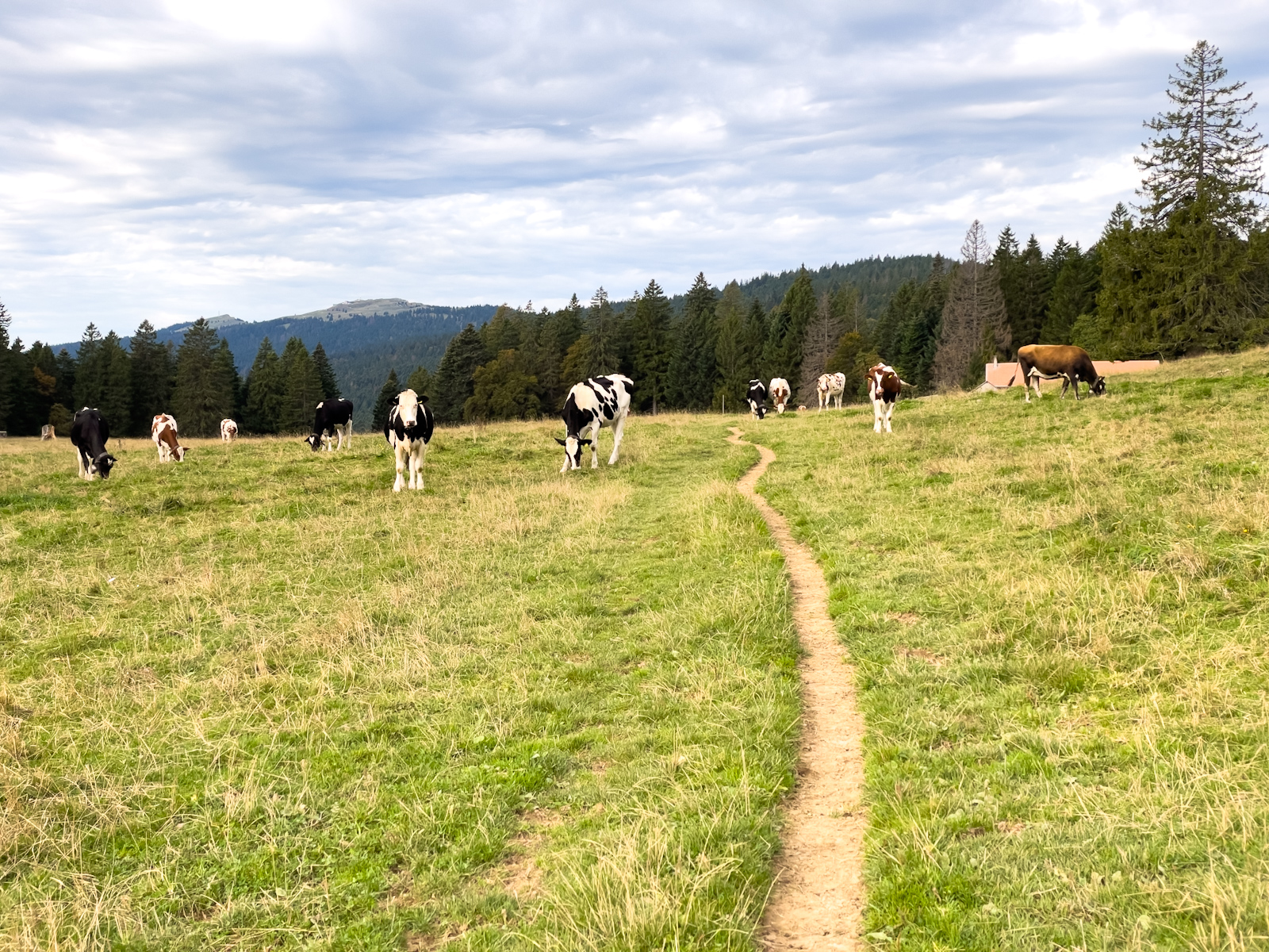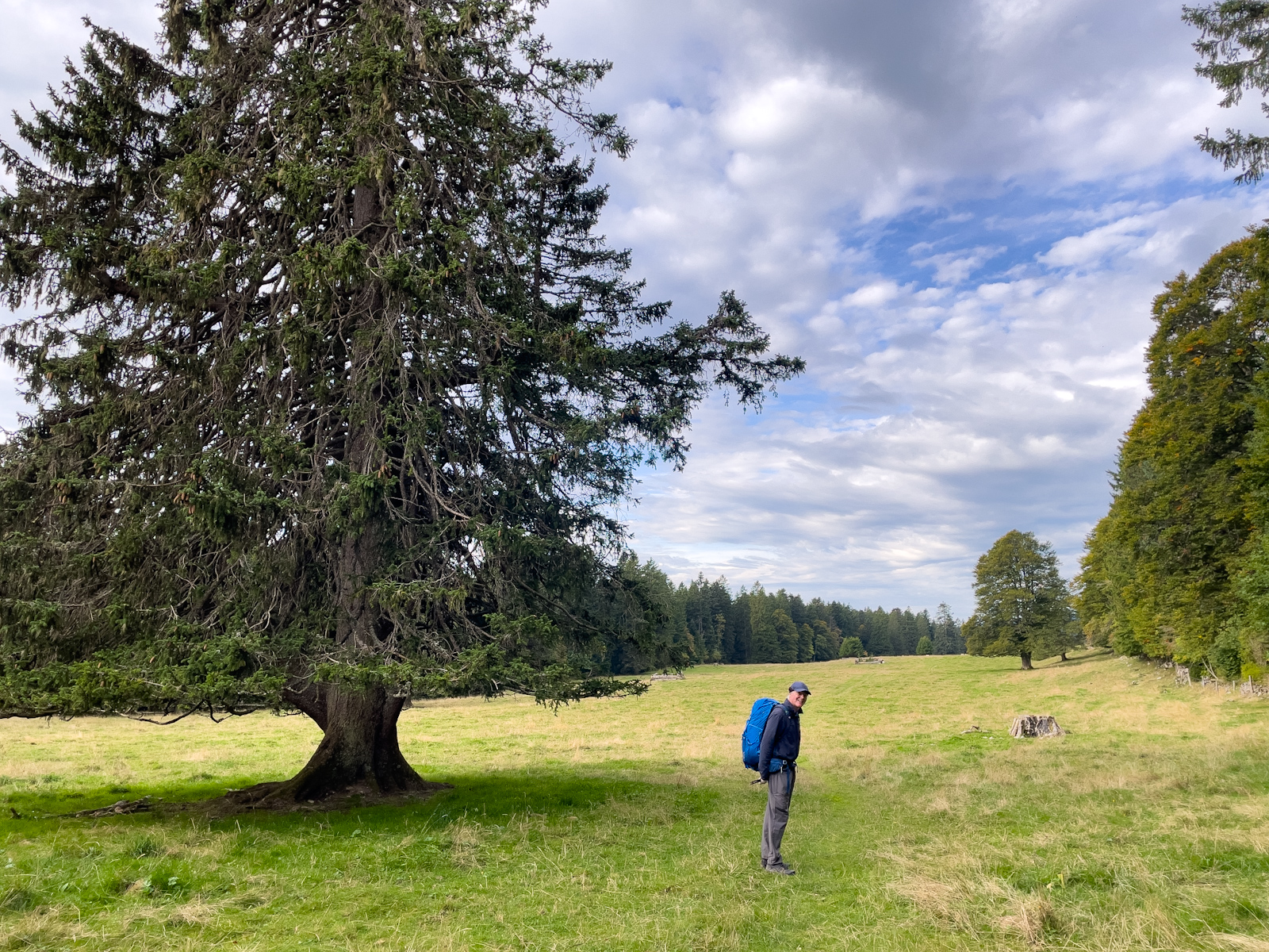 De klim naar de top gaat ons inmiddels best goed af. Dat komt mede omdat een groot deel over open hellingen loopt. Een prachtig landschap, en wat zijn er in de Jura toch veel schitterende vrijstaande bomen. Het gebel van de koeien draagt ook bij aan de sfeer.