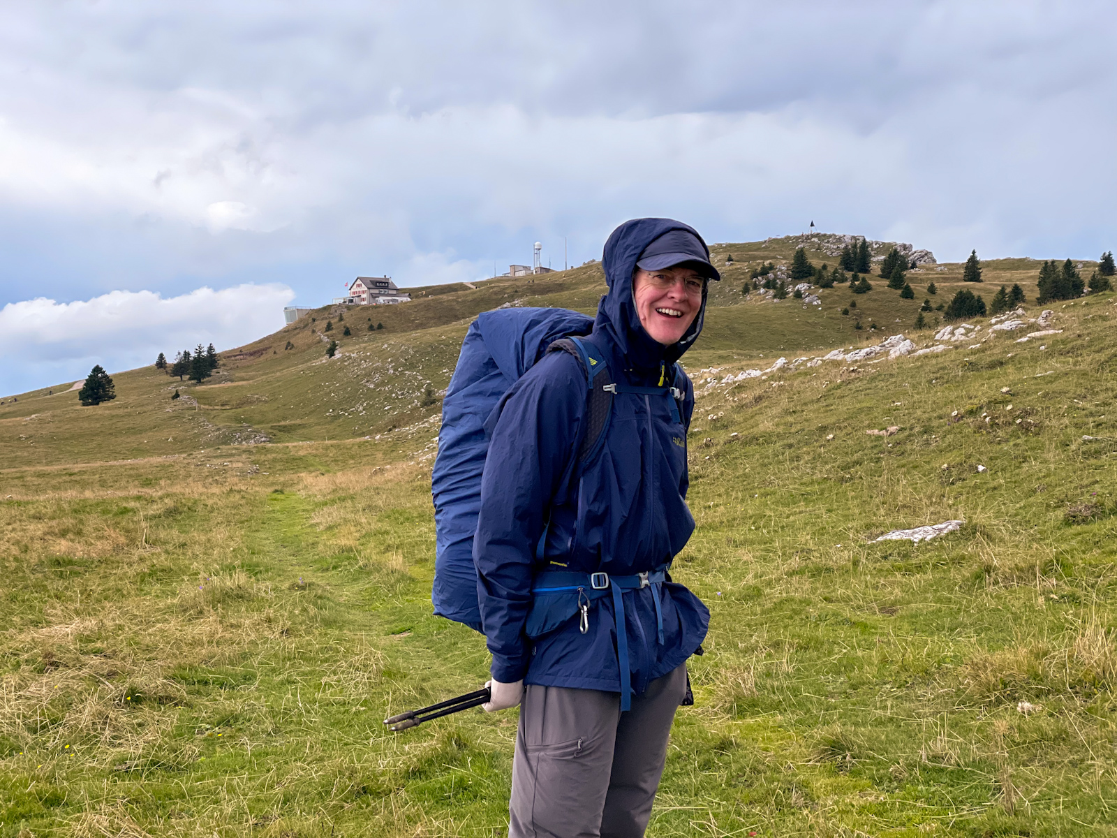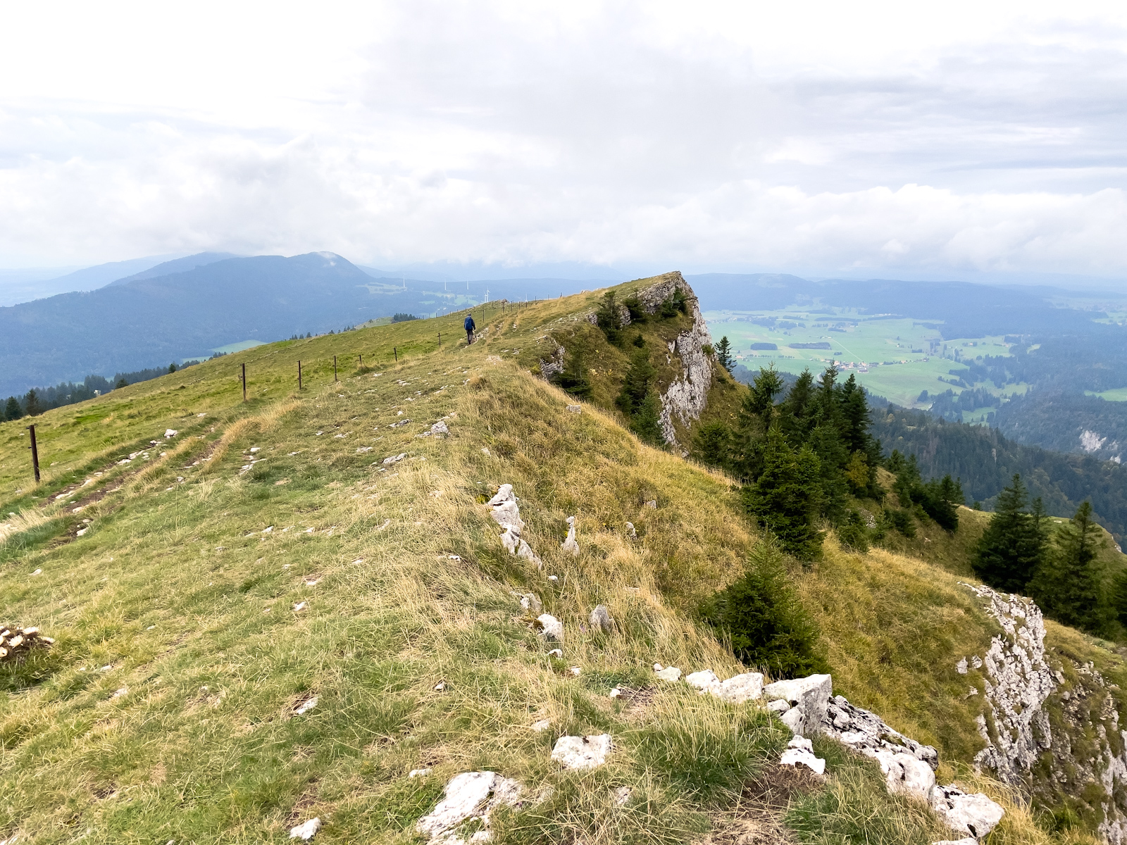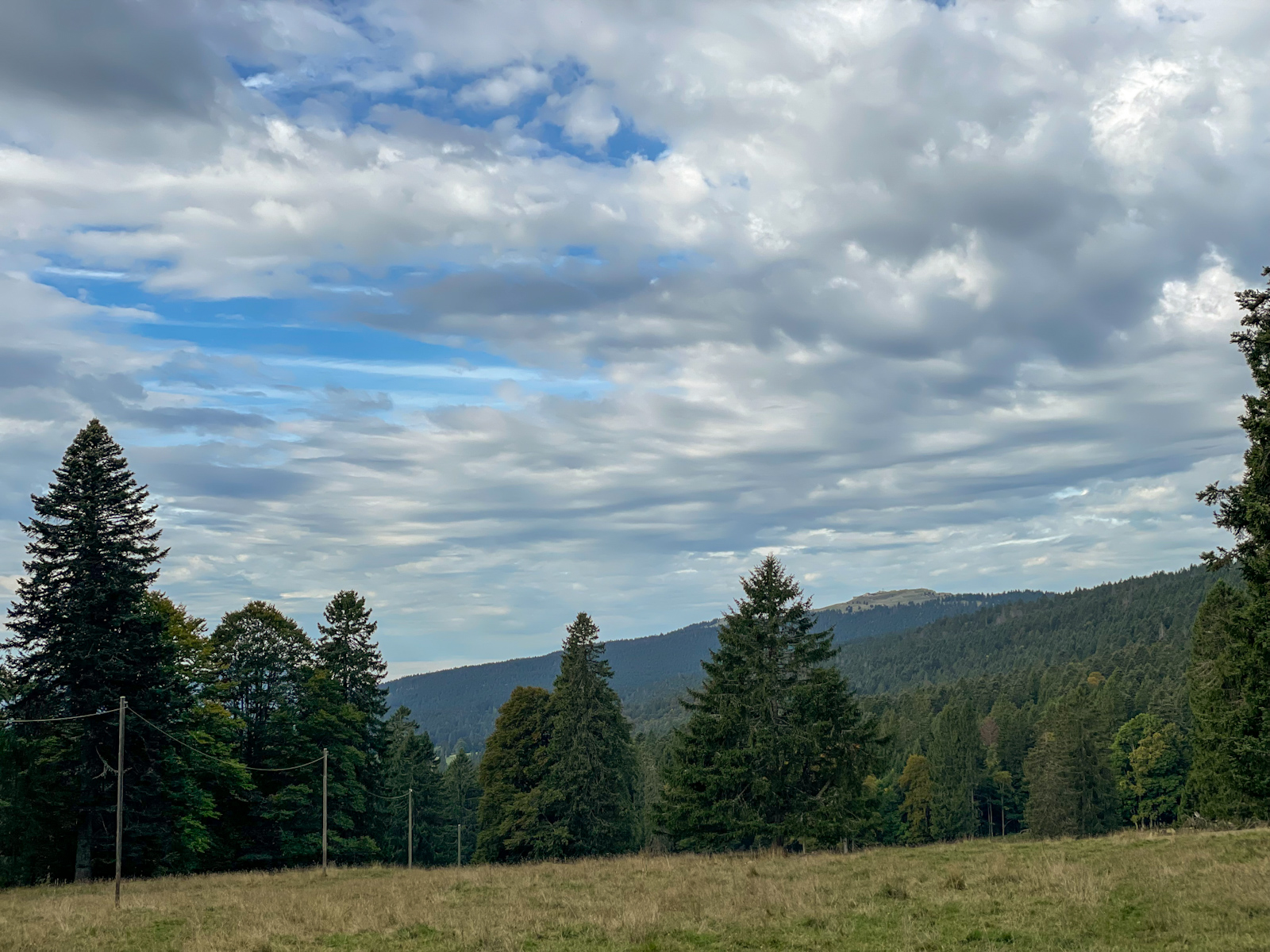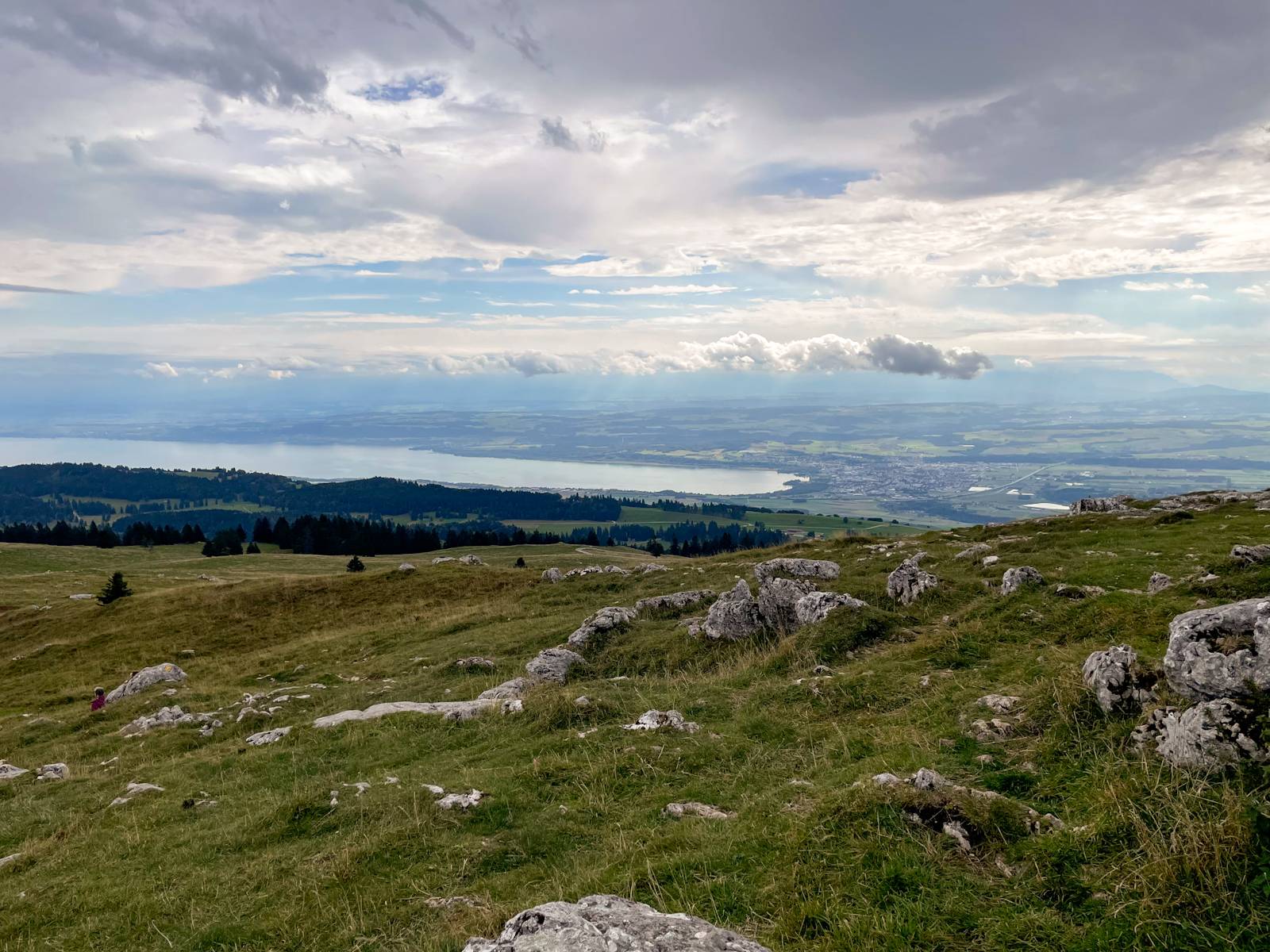 De klim naar de top gaat ons inmiddels best goed af. Dat komt mede omdat een groot deel over open hellingen loopt. Een prachtig landschap, en wat zijn er in de Jura toch veel schitterende vrijstaande bomen. Het gebel van de koeien draagt ook bij aan de sfeer.