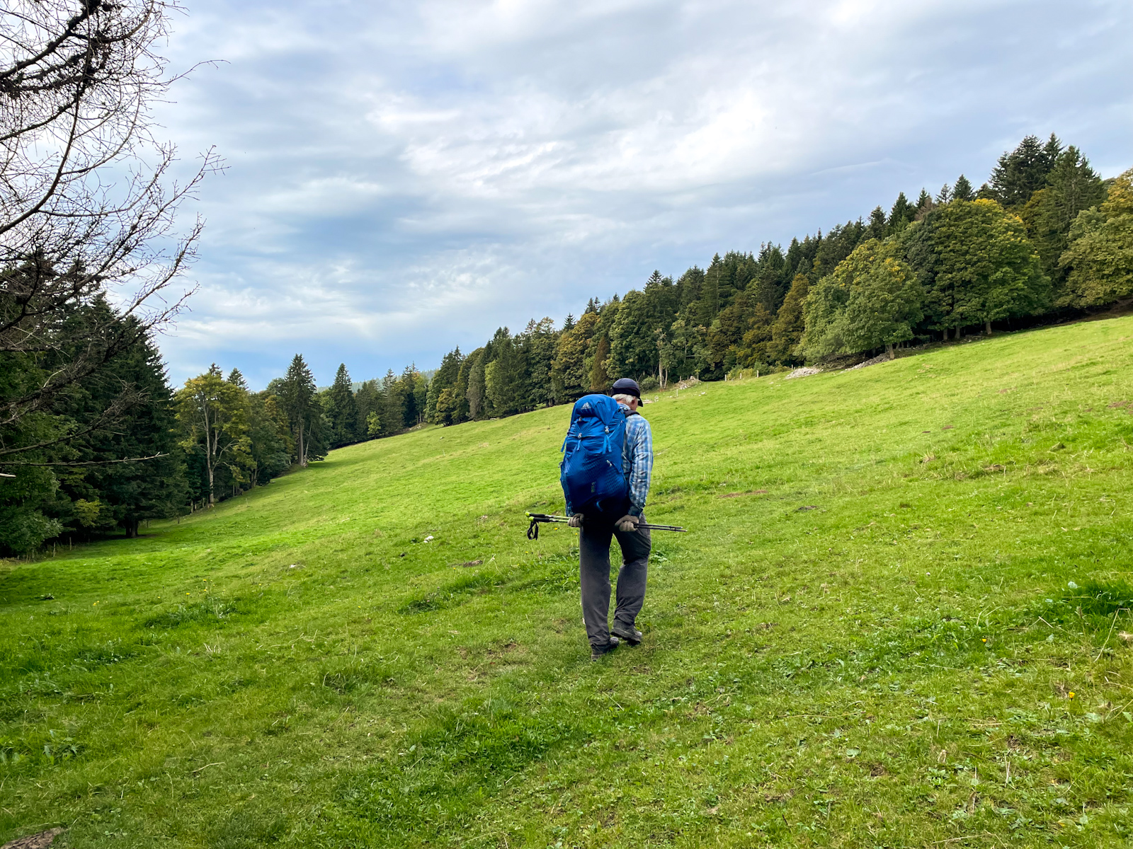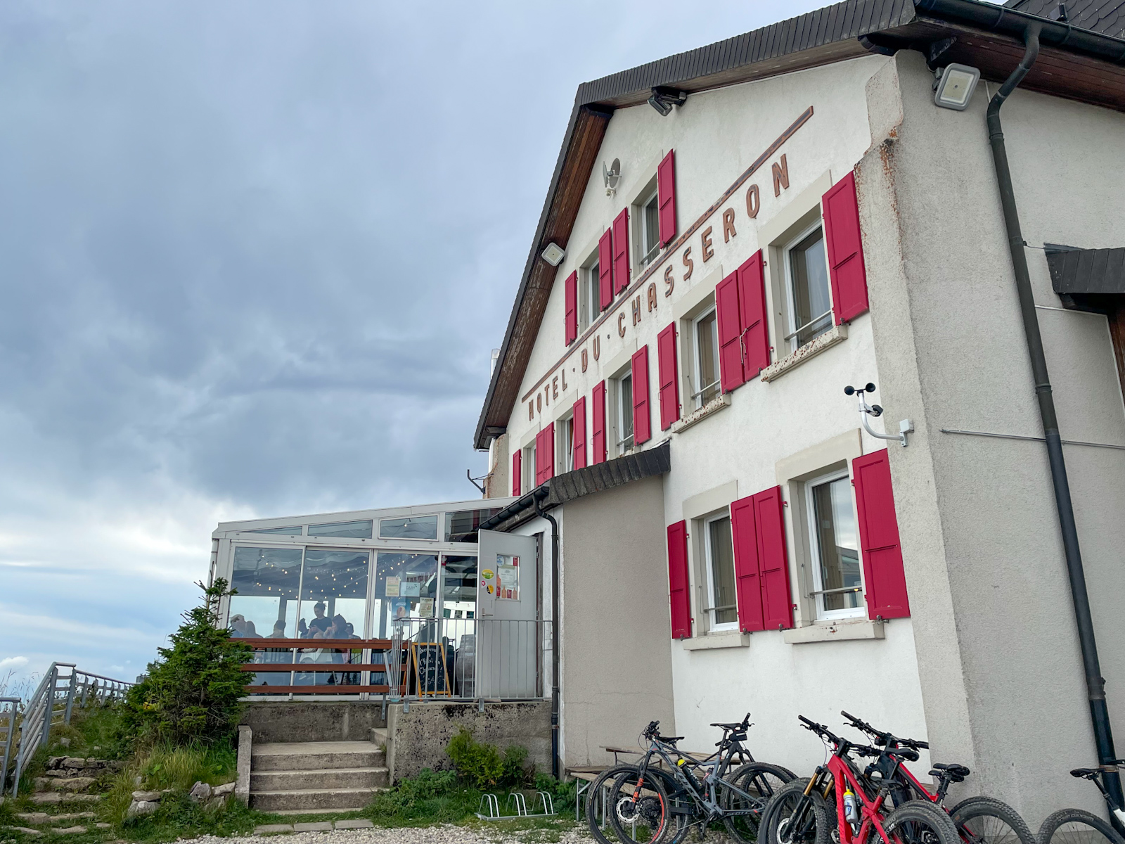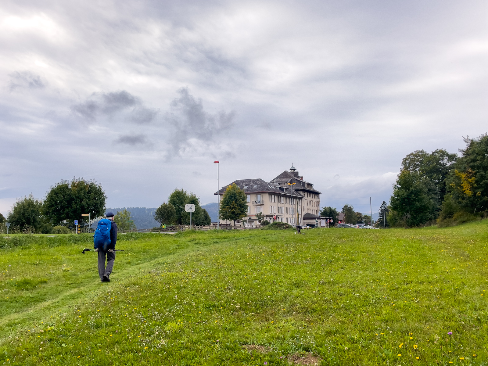 Daarna dalen we weer af. We hebben alle tijd, want het is een wat kortere etappe. We wijken af van de Jura Crest Trail omdat we een kamer hebben geboekt in het historische Grand Hôtel des Rasses uit 1898. Indrukwekkend groot, maar het kan wel een likje verf gebruiken. Onze kamer is heerlijk ruim en schoon, met een erker, bloemetjesgordijnen en een balkonnetje. Ook hier is de slijtage goed te zien, maar het stoort ons niet. In de gangen hangen mooie kroonluchters en in het trappenhuis zijn glas-in-loodramen.