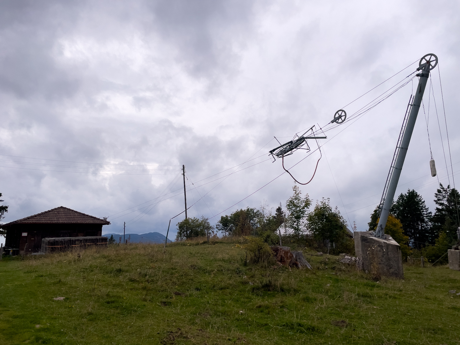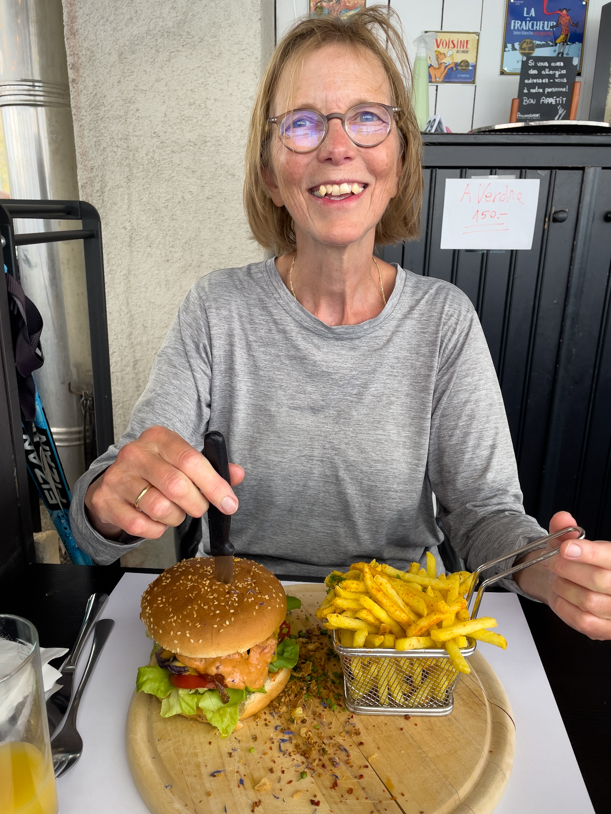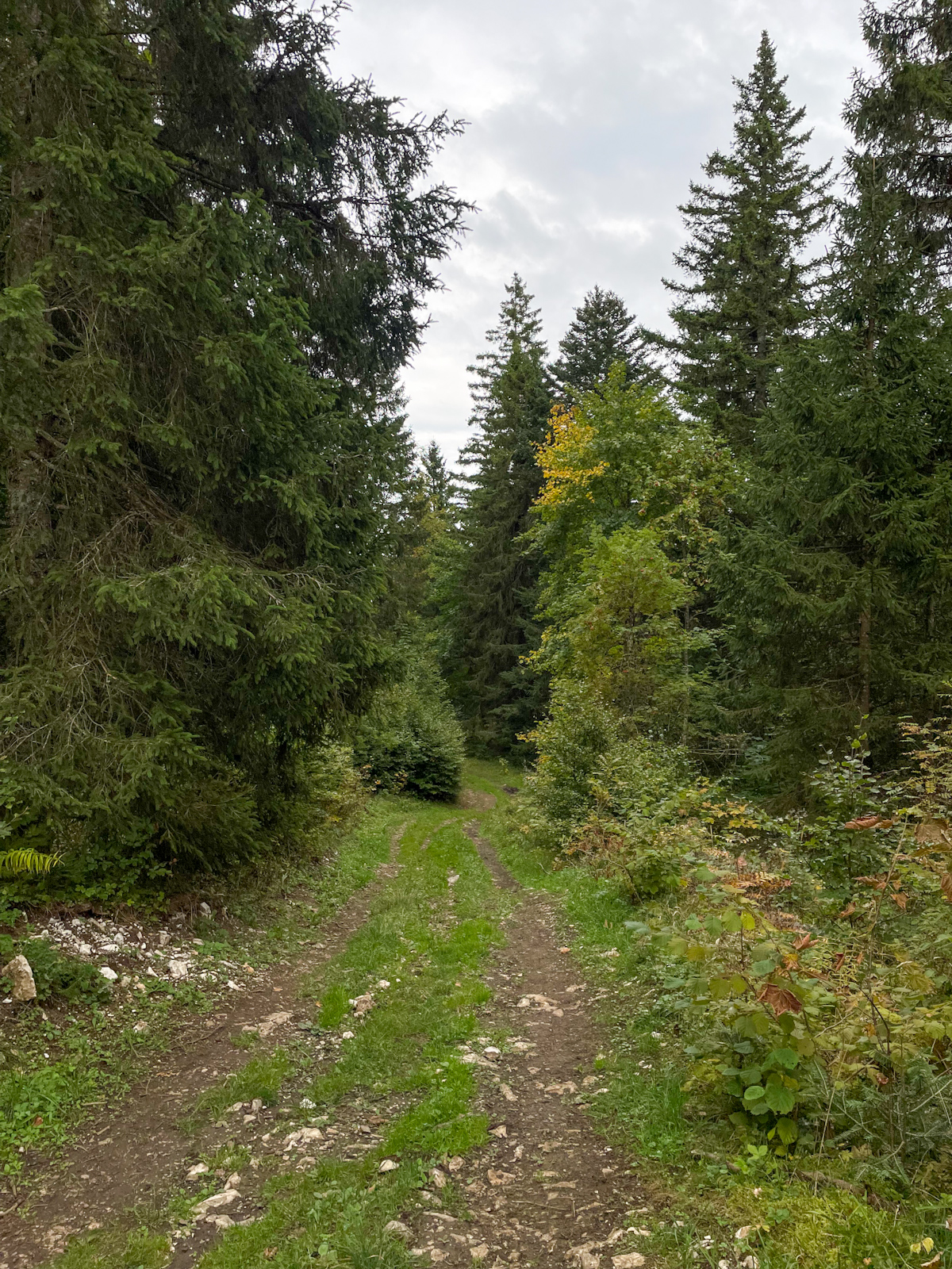 Daarna dalen we weer af. We hebben alle tijd, want het is een wat kortere etappe. We wijken af van de Jura Crest Trail omdat we een kamer hebben geboekt in het historische Grand Hôtel des Rasses uit 1898. Indrukwekkend groot, maar het kan wel een likje verf gebruiken. Onze kamer is heerlijk ruim en schoon, met een erker, bloemetjesgordijnen en een balkonnetje. Ook hier is de slijtage goed te zien, maar het stoort ons niet. In de gangen hangen mooie kroonluchters en in het trappenhuis zijn glas-in-loodramen.
