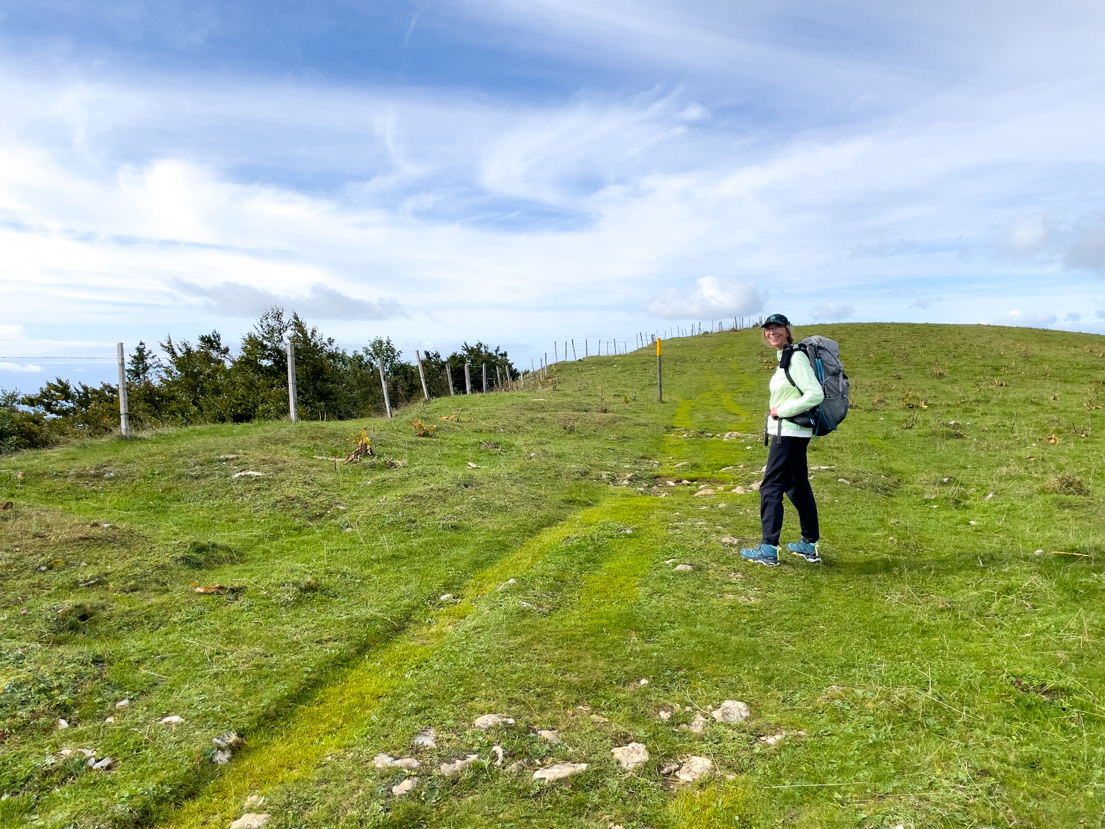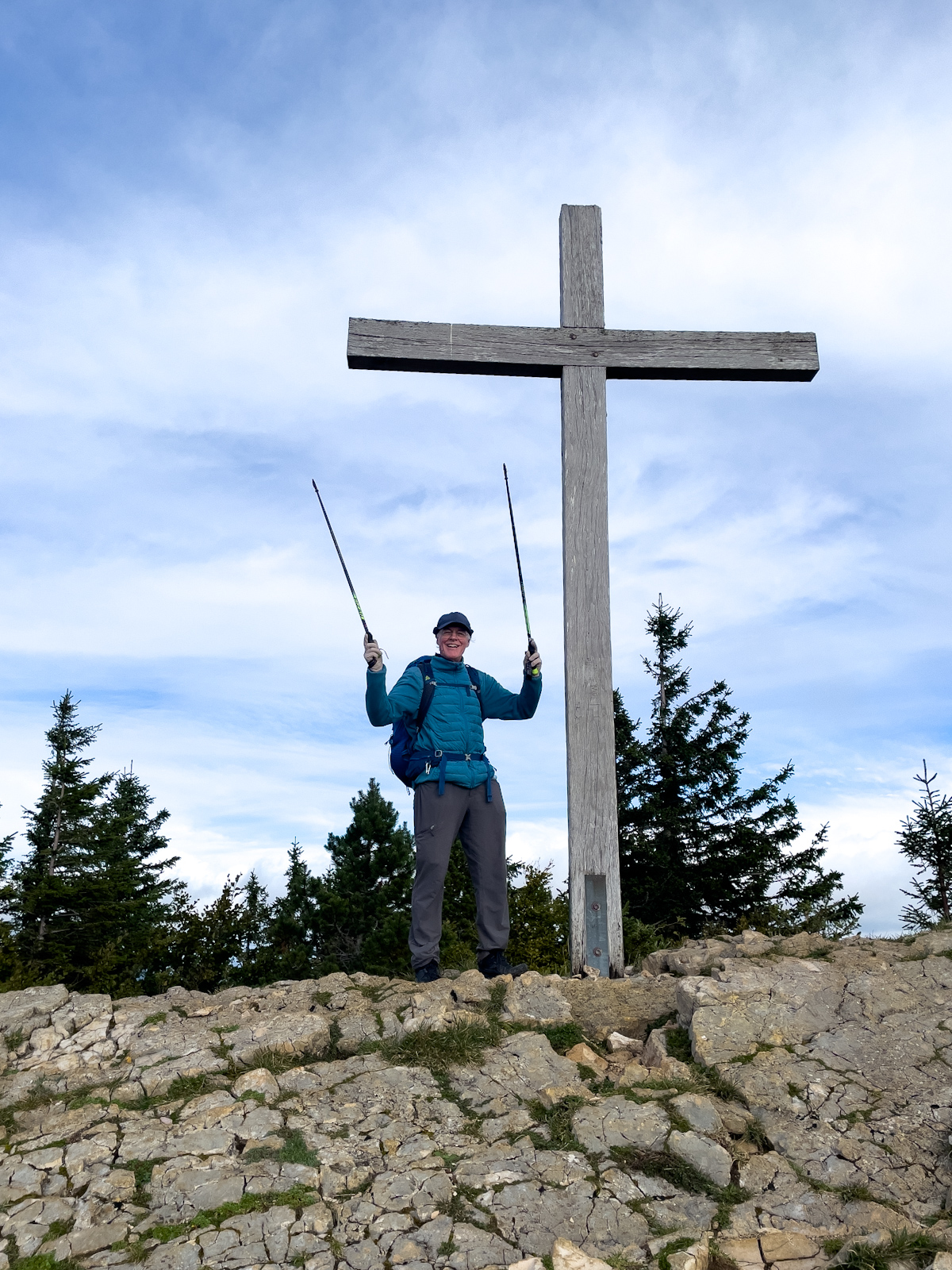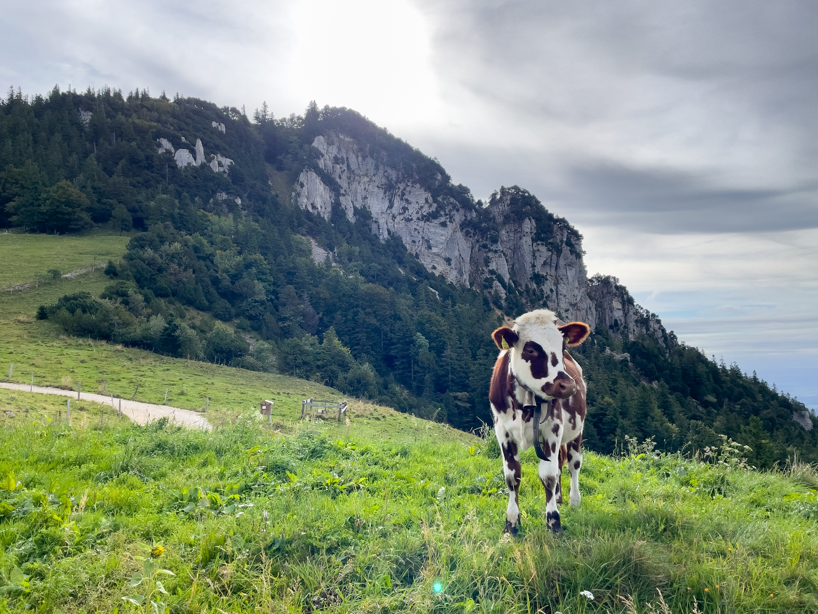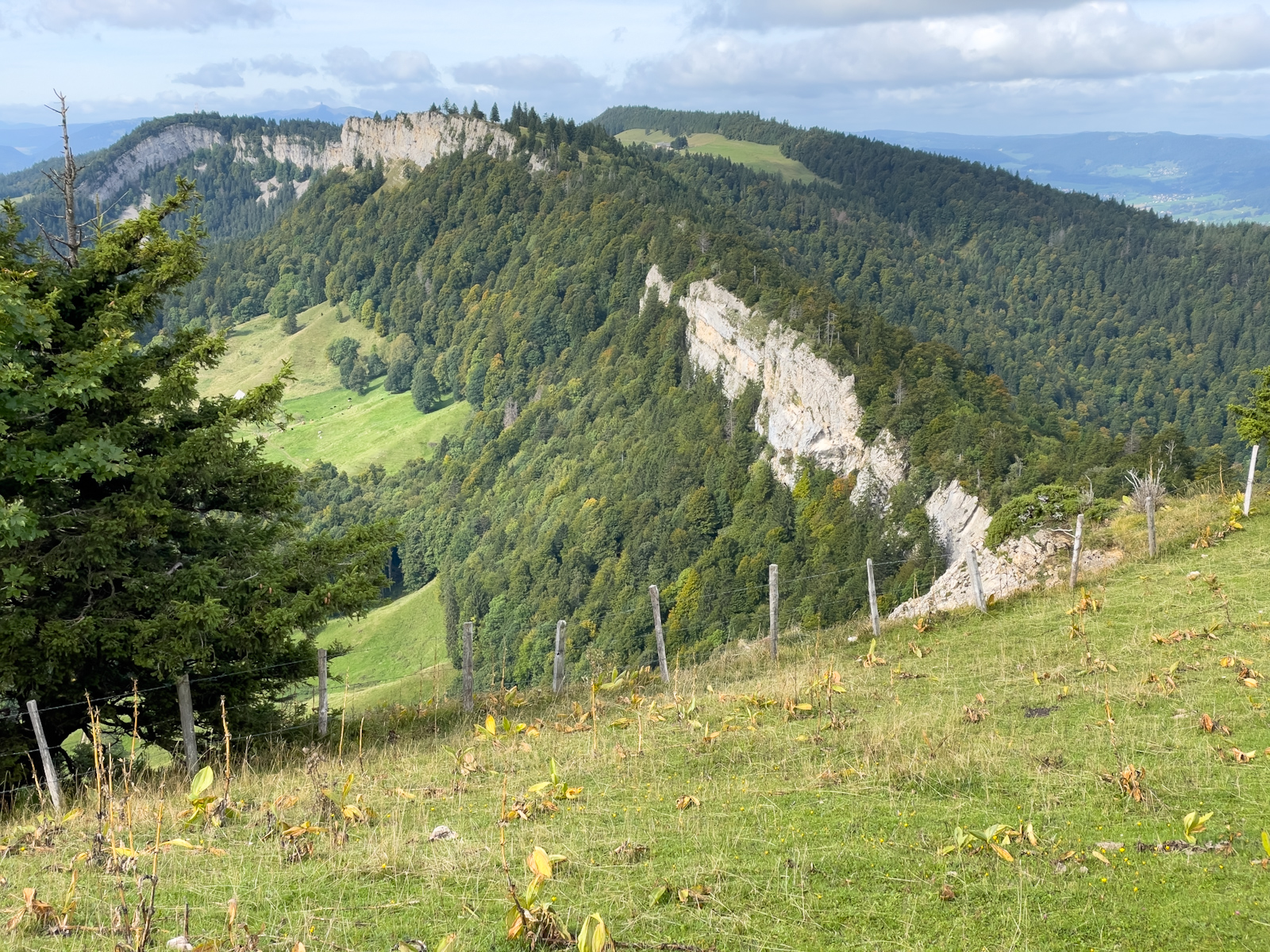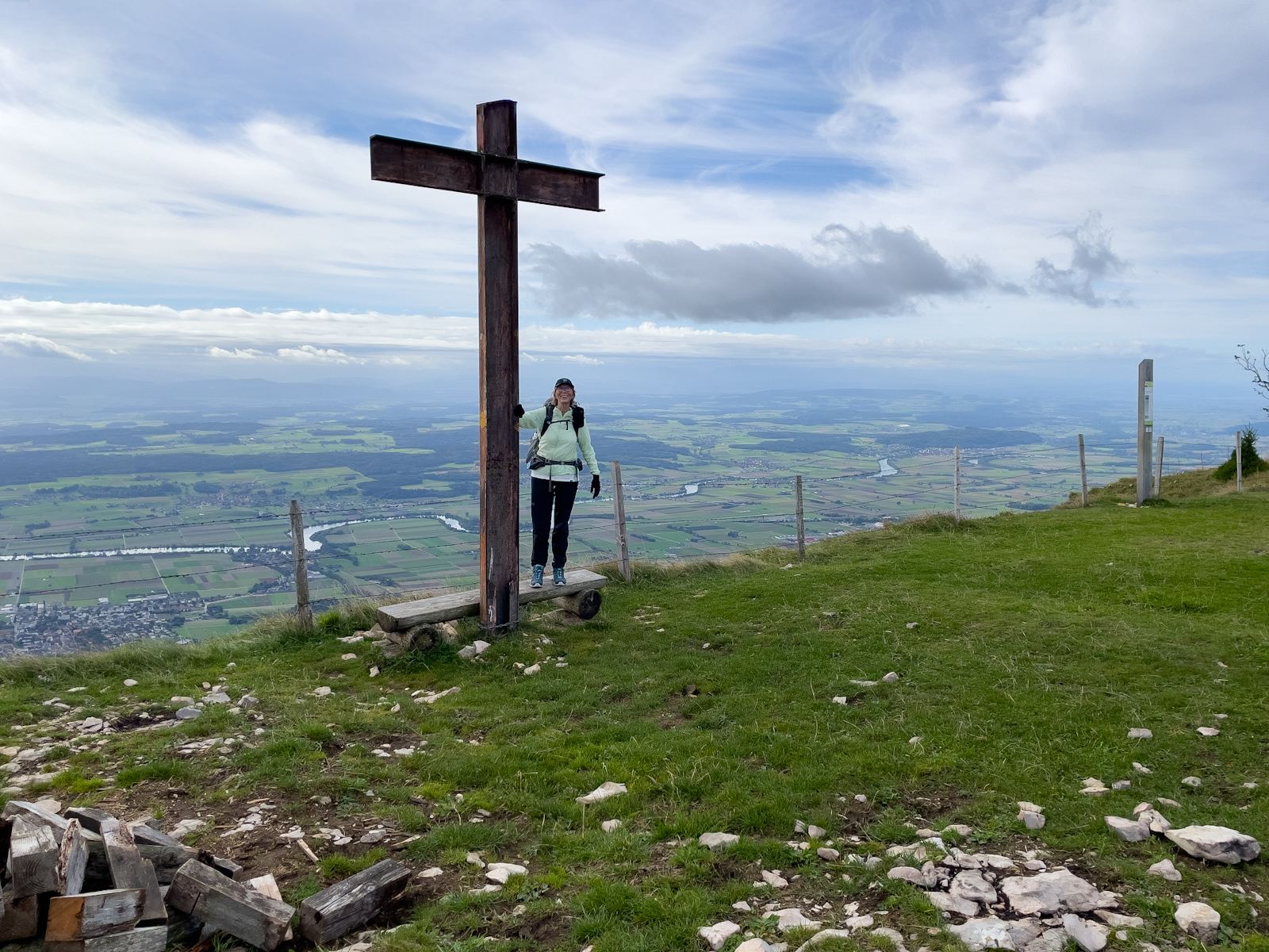 We klimmen door de bossen naar de Stallflue, een markante top op de Jura Crest Trail. Boven op de kam staat een groot kruis en hebben we prachtig uitzicht over het Mittelland en de golvende Juraheuvels. We dalen weer af om even later weer flink te klimmen naar de kam. We blijven nu wat langer hoog lopen. Mooi! Opnieuw passeren we een kruis.
