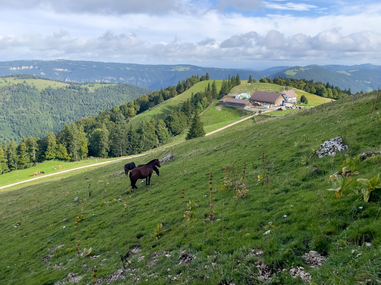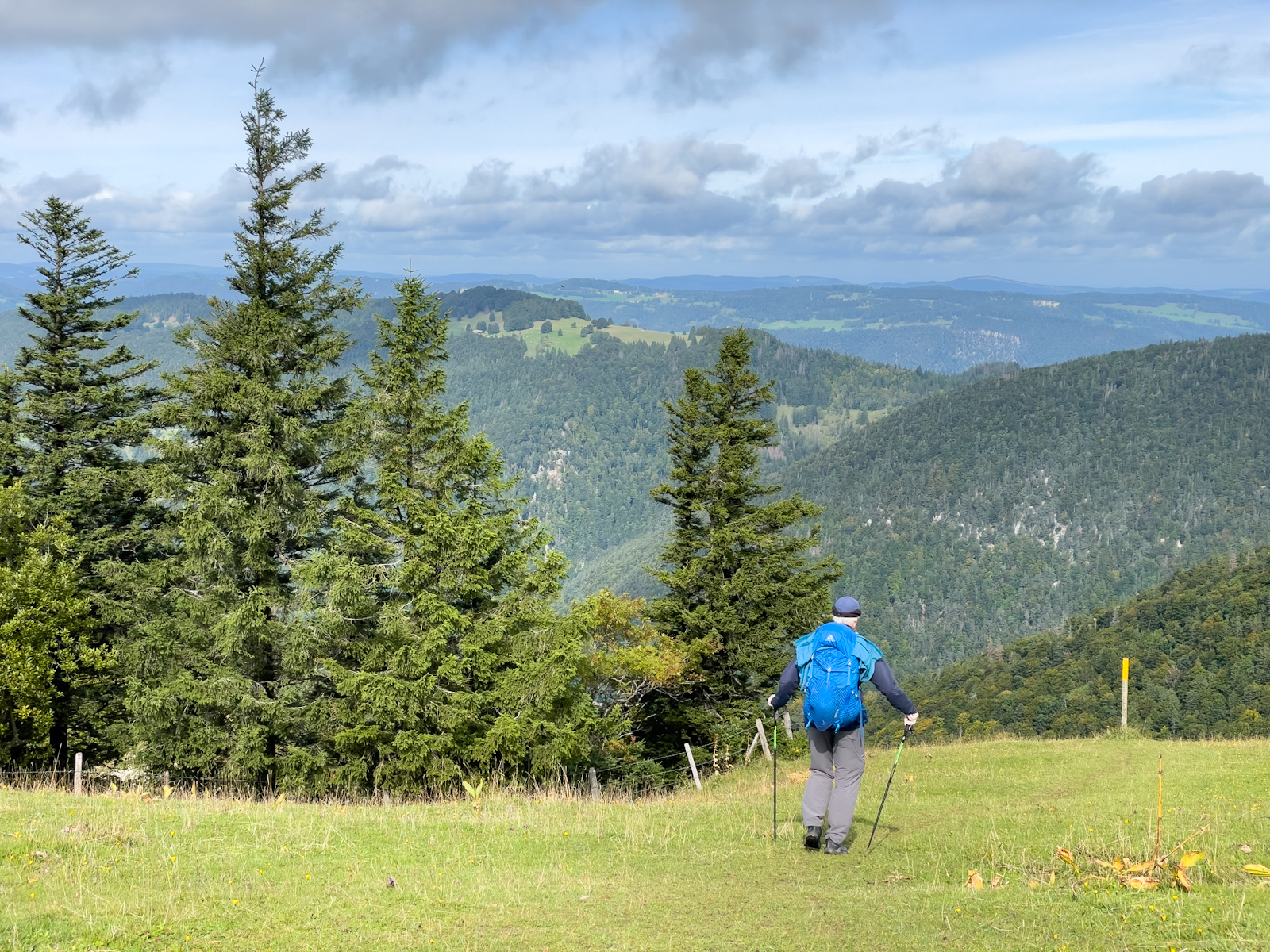 We vervolgen de Jura Crest Trail en het is meteen weer prachtig. Fantastisch uitzicht op de slingerende rivier de Aare door het Mittelland, en in de verte de Bielersee. Een hertje steekt het pad over en we zien roofvogels cirkelen. Na een tijdje komen we in het bos en beginnen we te klimmen. We hebben al gemerkt dat het vooral door de bossen omhoog of omlaag gaat. De bomen groeien op de steile flanken van de rotsachtige bergen. Zodra we over de kam lopen, wordt het meestal wat vlakker en opener, en zijn er vaak mooie uitzichten.