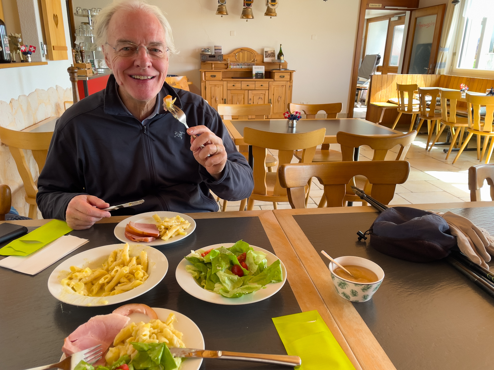 Om kwart voor twaalf zijn we bij Obergrenchenberg, een boerenbedrijf met café. De parasolletjes staan uitnodigend klaar, maar ze hebben weinig in huis en er is geen kaart. We delen de enige gerechten die ze wel hebben. Een Salat en hun allerlaatste portie Maccheroni. Beide met Schinken. We vragen ons af waarom ze al zo vroeg bijna door hun eten heen zijn, maar het smaakt heerlijk.