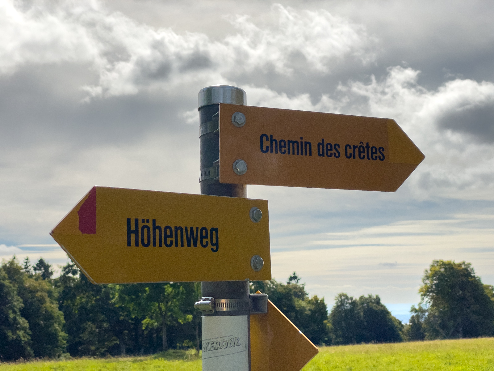 Na de lunch begint de lange afdaling naar Frinvillier. We smokkelen een stukje en lopen tot Wasmäli over een verhard weggetje in plaats van over het bospad. Het loopt wat sneller en zo winnen we wat tijd. Het is een lange etappe vandaag.