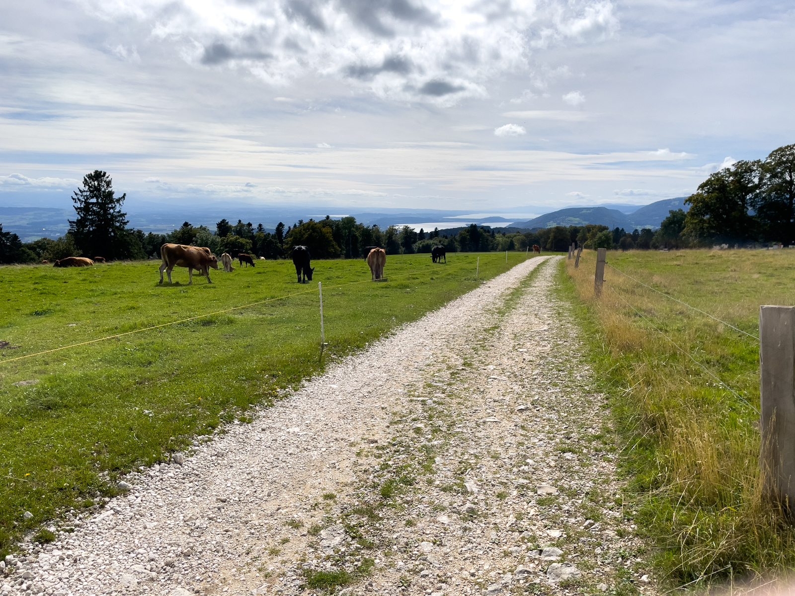 We dalen verder af. We lopen eerst door bos, daarna over de Montagne de Romont en passeren we mooie huizen en zomerhuisjes. Het pad voelt rustig en parkachtig. Na weer een stuk bos passeren we het plaatsje Plagne.